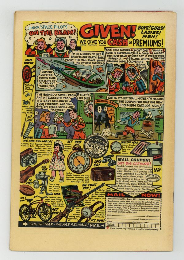 Ended May 5 2020 Winning Bid $135 Cover art by Win Mortimer. The Two Clark Kents starring Superboy, pencils by Curt Swan. The Aqua-Cop of the Sea starring Aquaman, art by Ramona Fradon. How to Spend a Summer Week! public service announcement starring Binky, script by Jack Schiff, art by Win Mortimer. The Impossible Deliveries starring Johnny Quick, art by Ralph Mayo. Varsity Vic humor page by Henry Boltinoff. The King of the Ivory Raiders starring Green Arrow, art by George Papp. 44 pages, Full Color. Cover price $0.10. Grade: FN- 5.5 explanation of grade Condition: Used (collectible)