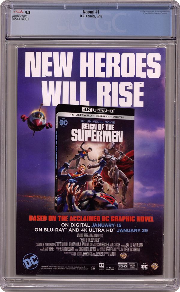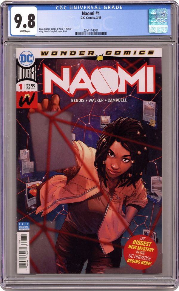 Ended Nov 1 2019 Winning Bid $113 Written by Brian Michael Bendis and David F. Walker. Art by Jamal Campbell. DC's biggest, newest mystery starts here! When a fight between Superman and Mongul crashes into a small Northwestern town, Naomi (last name?) begins a quest to uncover the last time a super-powered person visited her home-and how that might tie into her own origins and adoption. Follow Naomi's journey on a quest that will take her to the heart of the DC Universe and unfold a universe of ideas and stories that have never been seen before. Join writers Brian Michael Bendis, David Walker and breakout artist Jamal Campbell in Wonder Comics' massively ambitious new series and star... NAOMI. 36 pages, full color. Rated T+ Cover price $3.99. Grade: CGC 9.8 explanation of grade Condition: Used (collectible)