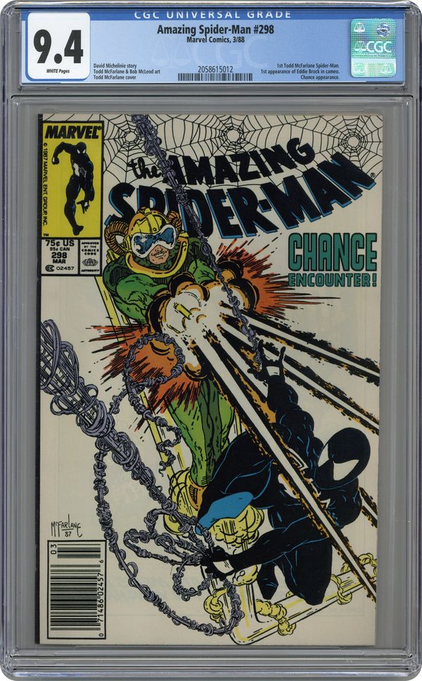 Ended Jan 20 2020 Winning Bid $91 Direct Edition. "Chance Encounter!" Part 1 of 2. Script by David Michelinie. Pencils by Todd McFarlane. Inks by Bob McLeod. Cover by Todd McFarlane. Chance is back in business and working a new job for the Life Foundation! The clandestine organization wants Chance to steal an arms shipment coming into the west side docks! That should be a piece of cake for the high-flying mercenary! However, the Daily Bugle dispatches an undercover photographer to observe the delivery! And beneath the moonlit sky, fireworks explode when Chance and the Amazing Spider-Man throw down on the docks! First appearance (and cameo on the last page) by Eddie Brock (aka Venom). First appearance of Carlton Drake of the Life Foundation. Cameo appearances by Mary Jane Watson, Joy Mercado, and Joe Robertson. (Notes: Chance previously appeared in Web of Spider-Man 15. This issue begins Todd McFarlane's 2-year run as the penciler of the Amazing Spider-Man series.) 36 pages. Cover price $0.75. Grade: CGC 9.4 explanation of grade Condition: Used (collectible)