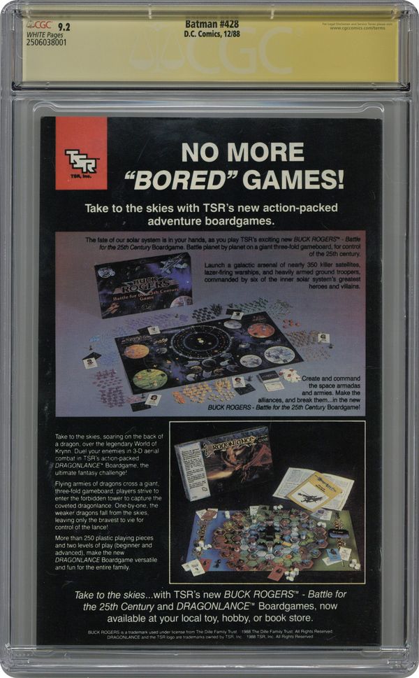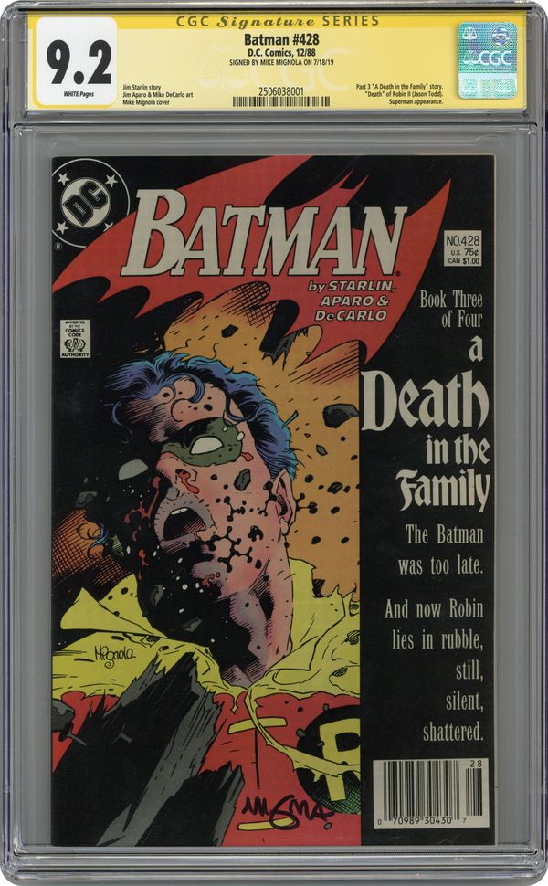 Ended Jan 14 2020 Winning Bid $85 First printing. Direct Edition. Cover art by Mike Mignola. "A Death in the Family" part 3 of 4, script by Jim Starlin, pencils by Jim Aparo, inks by Mike DeCarlo; Death of Sheila Haywood; Burial of Sheila Haywood and Jason Todd; The Joker becomes the Iranian Ambassador to the U.N. Results of Phone Poll as to whether Robin dies this issue or not. NOTE: Most issues from 397-432 were reprinted in 1989 and sold in multipacks. These 2nd and 3rd prints have back cover ads dated 1989. 36 Pages, Full Color. Cover price $0.75. Grade: CGC 9.2 explanation of grade Condition: Used (collectible)