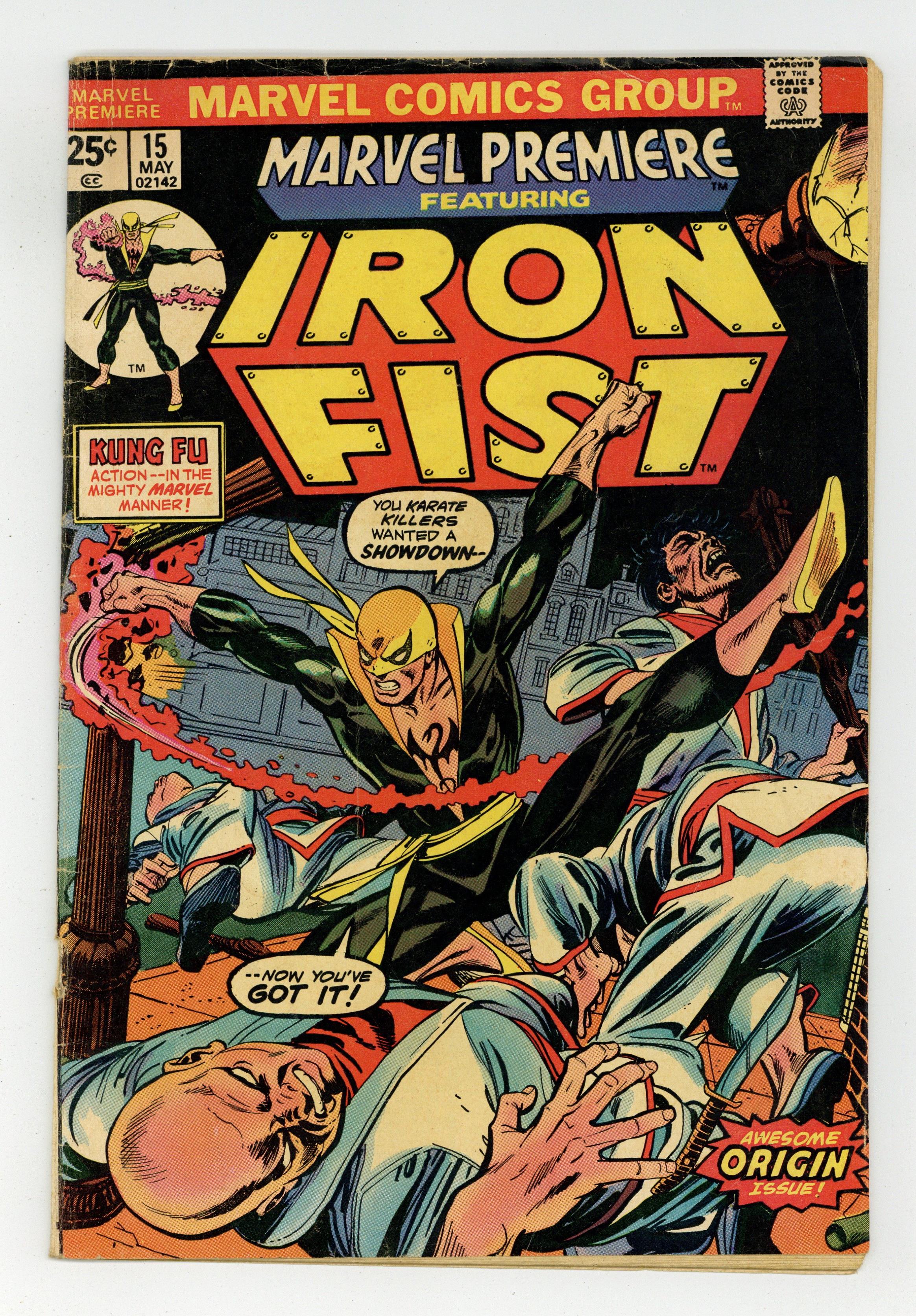 Ended May 10 2020 Winning Bid $88 First 25-cent cover price. Origin and first appearance of Iron Fist in The Fury of Iron Fist!, script by Roy Thomas, pencils by Gil Kane, inks by Dick Giordano; Iron Fist passes the final tests in his K'un-Lun training and is granted the privilege of immortality if he so chooses; During his final battle with the robot Shu-Hu, Danny remembers how his father was killed by Meachum and his mother gave her life to save his as the Rand family searched for the fabled city of K'un-Lun. The letters page contains Marvel Value Stamp series A # 94 (Electro by Steve Ditko). Text article explaining price hike to 25 cents for Marvel's 36-page comics, followed by short editorial by Roy Thomas detailing genesis of Iron Fist. 36 pgs. $0.25. Cover price $0.25. Grade: GD/VG 3.0 explanation of grade Condition: Used (collectible)