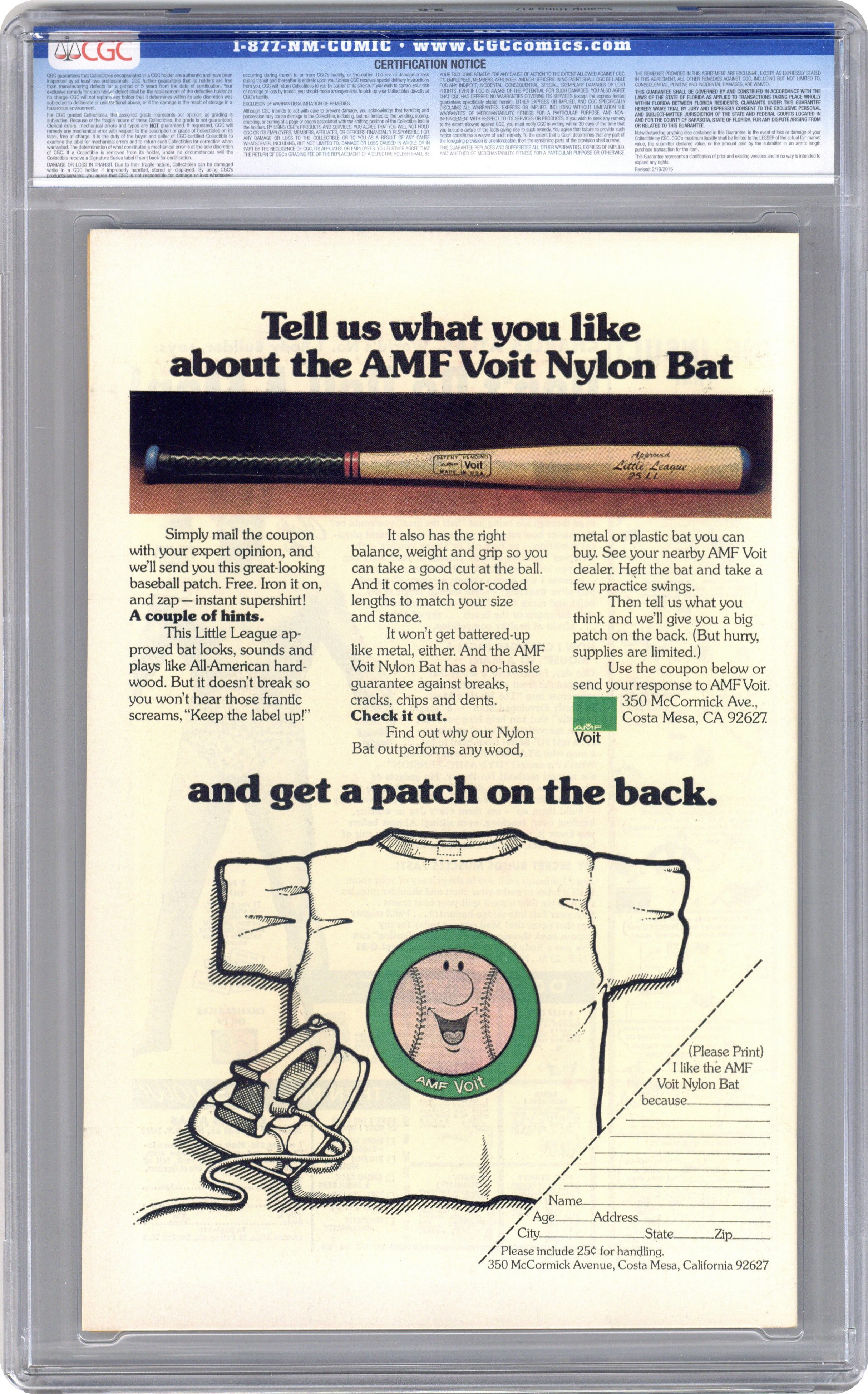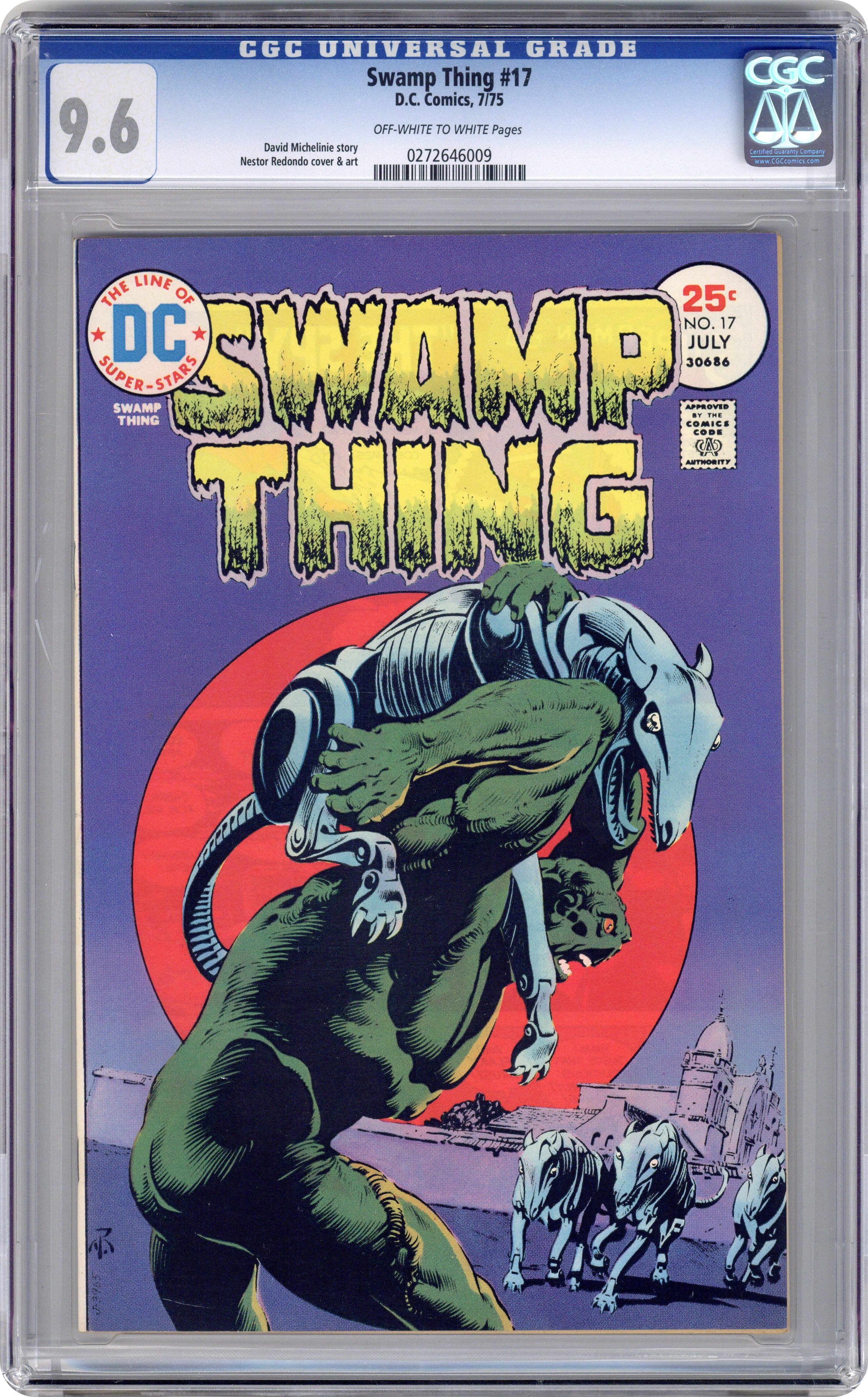 "The Destiny Machine." Swamp Thing goes after Nathan Ellery and the Conclave, who have captured Matt, Abby, and Jeff. Script by David Michelinie, art by Nestor Redondo. Cover by Redondo. Cover price $0.25. Grade: CGC 9.6 explanation of grade Condition: Used (collectible)