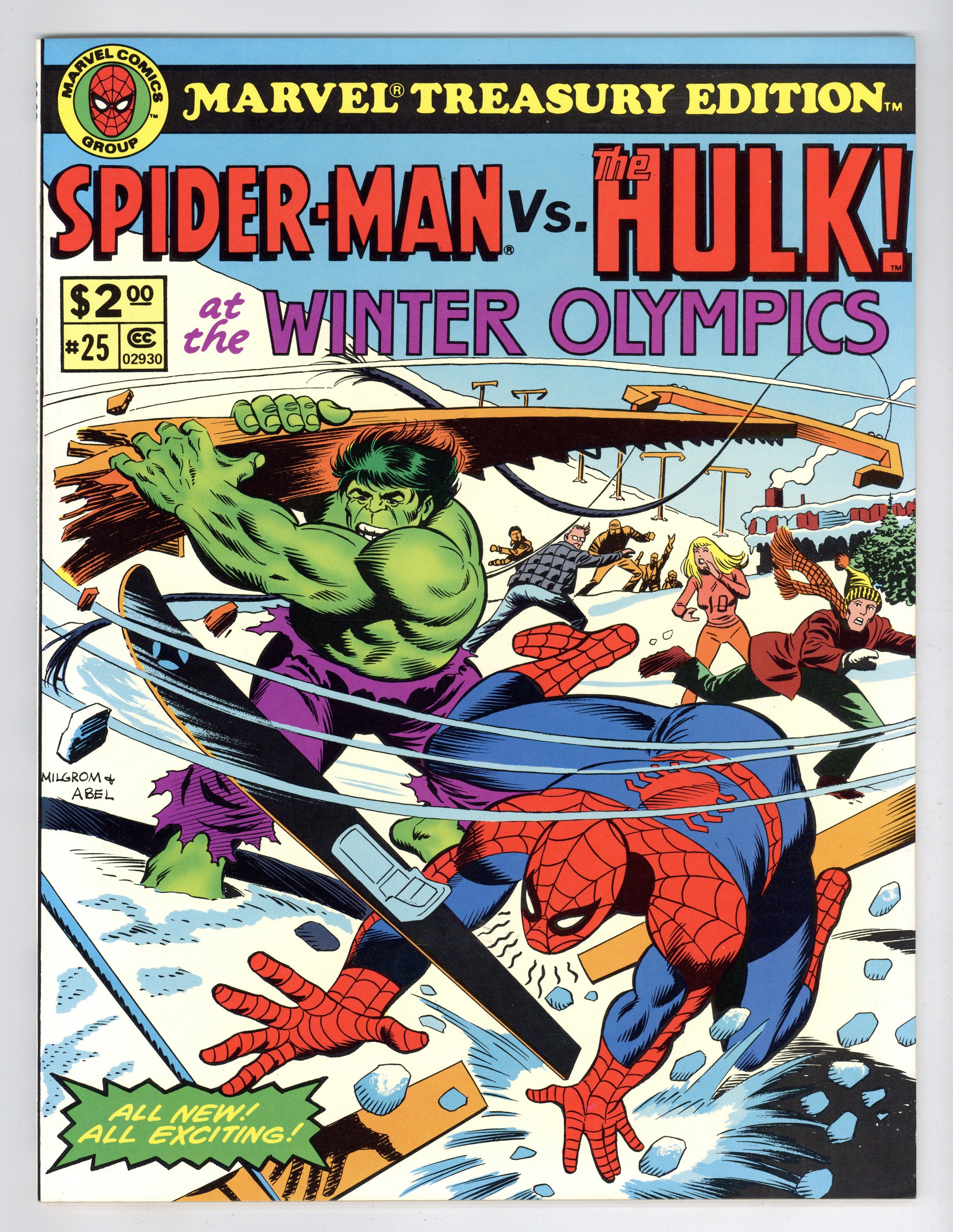 Ended May 8 2020 Winning Bid $106 Marvel Treasury Edition (1974) #25 features Spider-Man vs. the Hulk at the Winter Olympics. The web-Head and Jade Giant battle evil and each other amidst the Winter Games in an all new adventure brought to you by Bill Mantlo (script/story), Mark Gruenwald (story), Steven Grant (story), Herb Trimpe (pencils), and Bruce Patterson (inks). 64 pages. Cover price $2.00. Grade: NM- 9.2 explanation of grade Condition: Used (collectible)