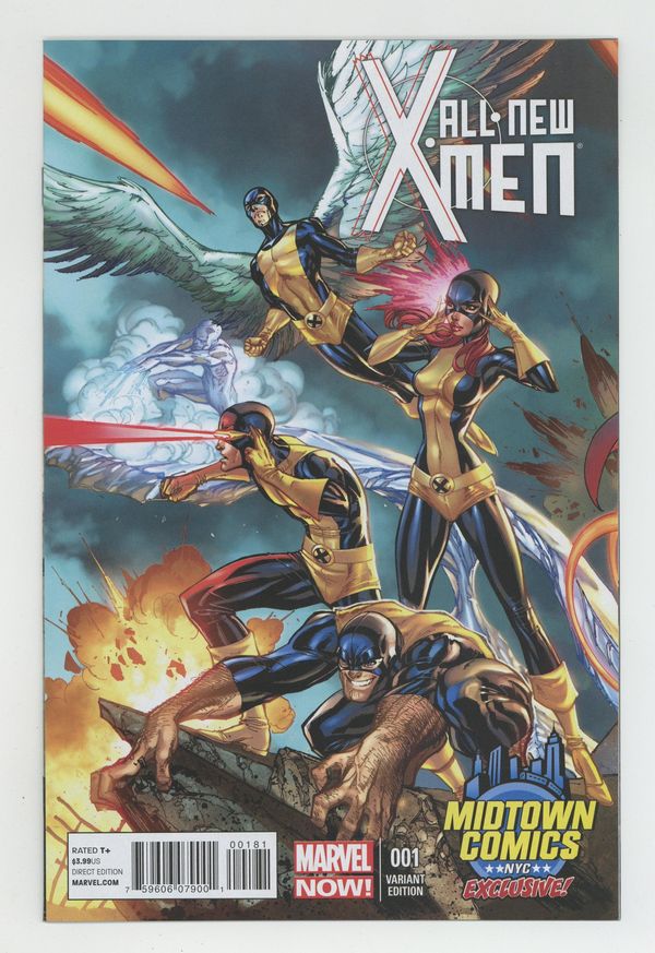 Midtown Comics NYC Exclusive Cover by J. Scott Campbell. NOTE: The cover of this comic interlocks with Midtown exclusive Avengers #1 and Uncanny Avengers #1 to create a huge crossover cover. Written by Brian Michael Bendis. Art by Stuart Immonen. It's a blast from the past as the original five students of Professor X - Cyclops, Marvel Girl, Iceman, Angel and Beast - are plucked from the past and brought to the present. But what they find, the state that their future selves are in and the state of Xavier's dream, is far from the future they dreamed of. And how will the X-Men of the present deal with their past coming crashing forward? Grade: VF 8.0 explanation of grade Condition: Used (collectible)