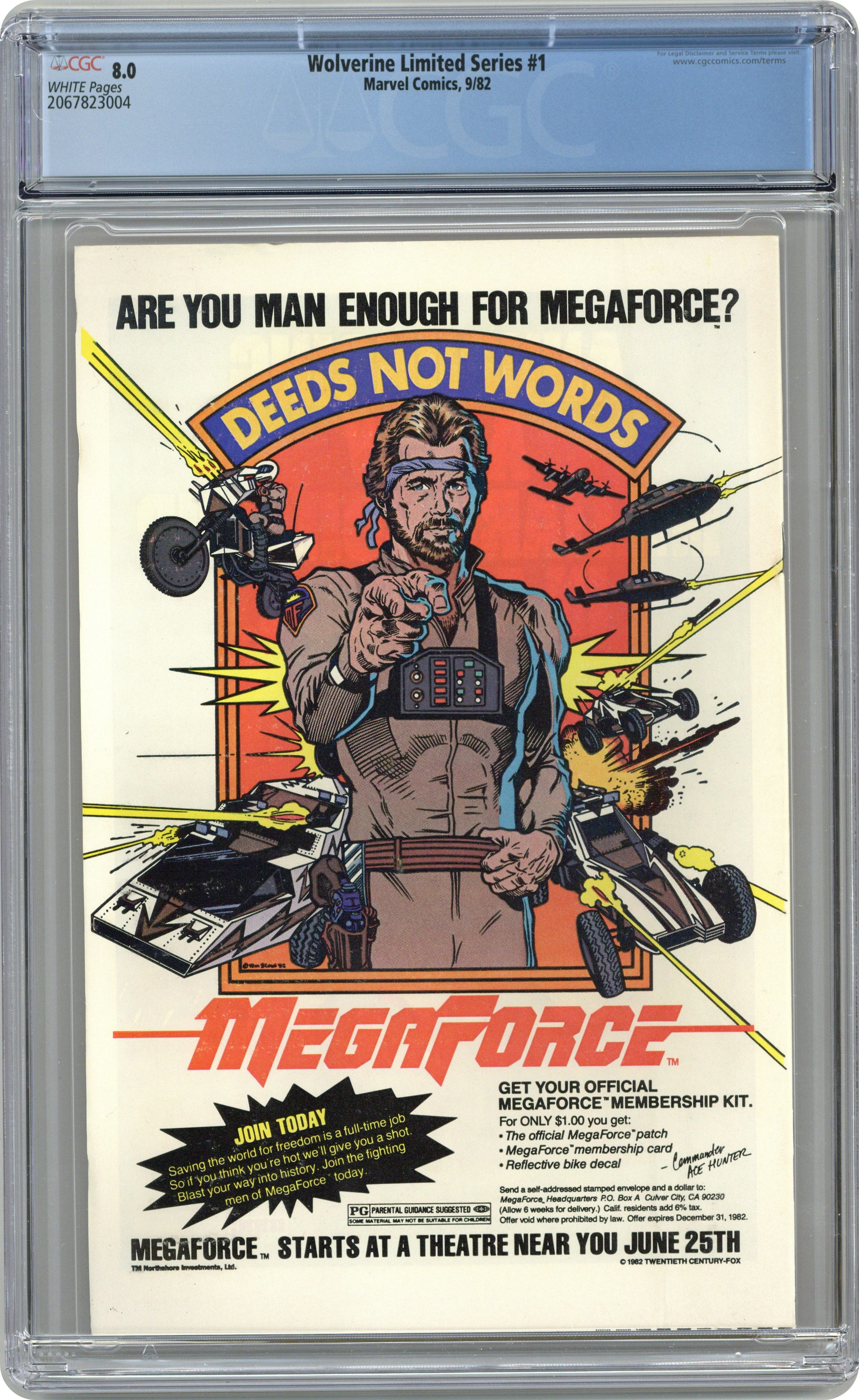 Ended May 12 2020 Winning Bid $76 Direct Edition. 1 of 4 Featuring Wolverine in his first solo series fighting in Japan. "Wolverine." Script by Chris Claremont, pencils by Frank Miller, inks by Joe Rubinstein. Miller/Rubinstein cover. Back cover MegaForce ad with art by William Stout. Cover price $0.60. Grade: CGC 8.0 explanation of grade Condition: Used (collectible)