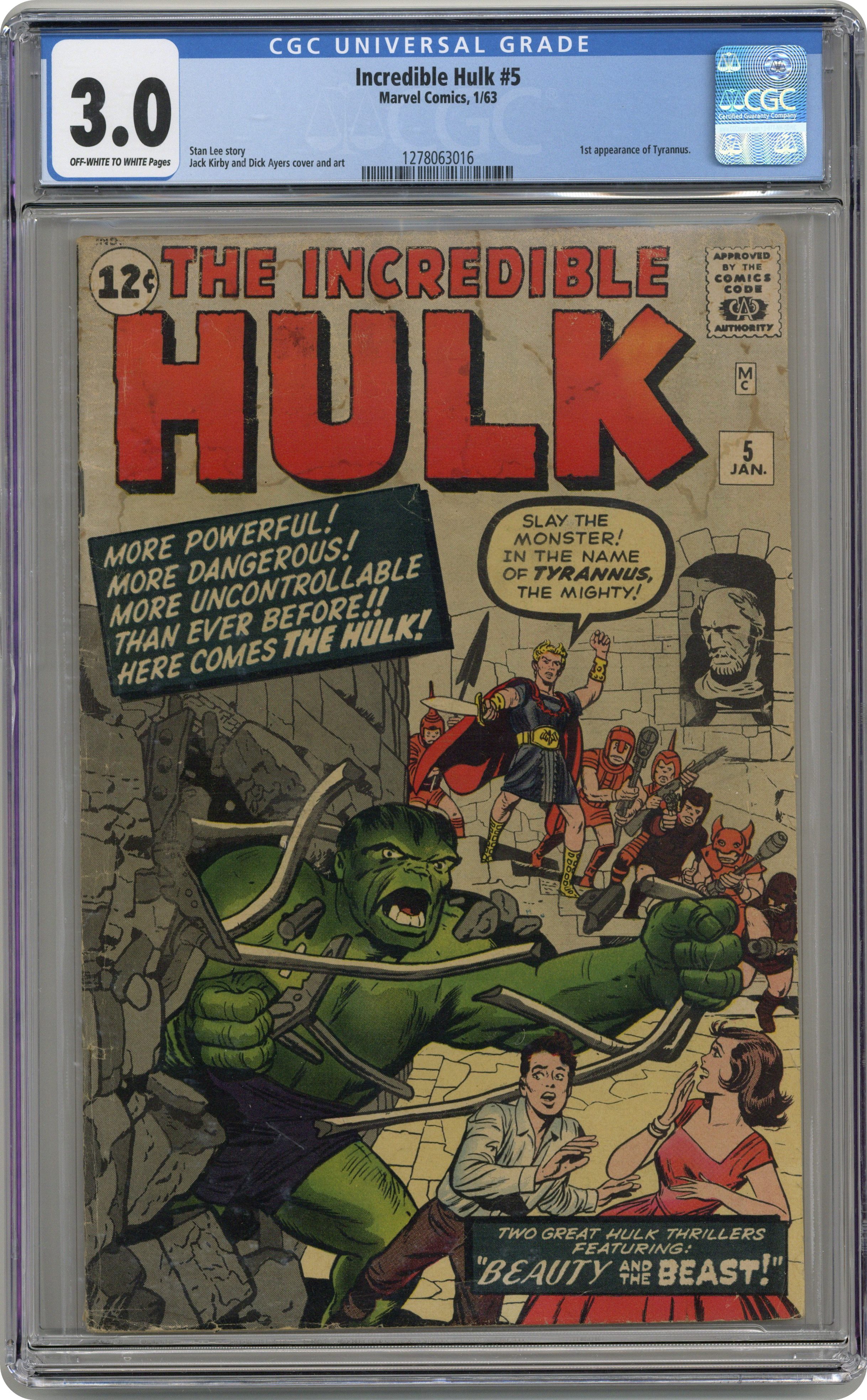 Ended May 8 2020 Winning Bid $325 Cover pencils by Jack Kirby, inks by Dick Ayers. "Beauty and the Beast!," script by Stan Lee, pencils by Jack Kirby, inks by Dick Ayers; Underground overlord Tyrannus kidnaps Betty and lures the Hulk into his subterranean kingdom, forcing the Hulk to do his bidding to keep Betty safe. "The Hordes of General Fang!," script by Stan Lee, pencils by Jack Kirby, inks by Dick Ayers; The Hulk thwarts a would-be Genghis Khan conqueror named General Fang from taking over the Asian province of Llhasa, and he only has to dress up as the Abominable Snowman once to do it. 36 pgs., full color. $0.12. Cover price $0.12. Grade: CGC 3.0 explanation of grade Condition: Used (collectible)