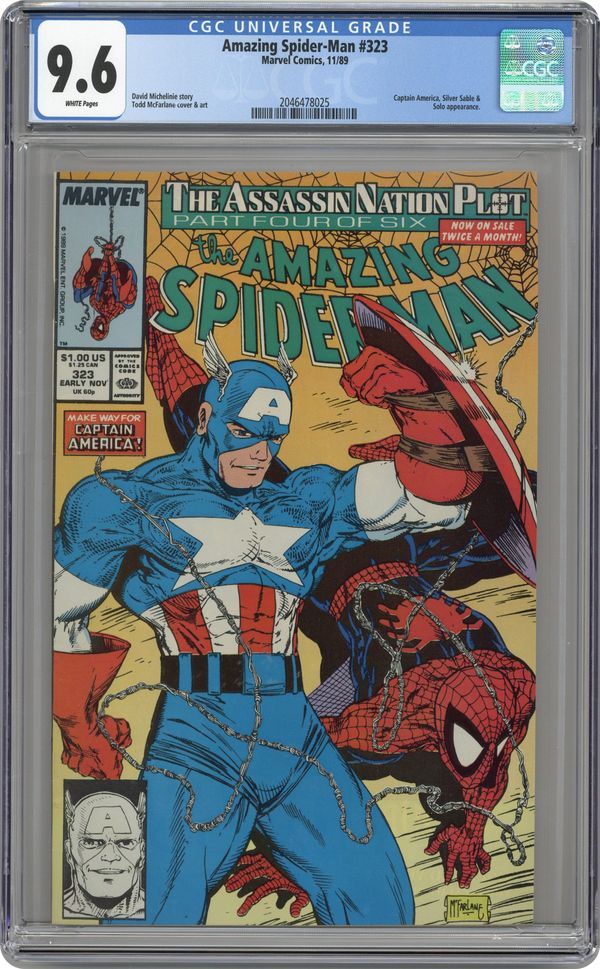 Ended May 6 2020 Winning Bid $41 Direct Edition. "Assault Rivals!" The Assassin Nation Plot Part 4 of 6. Guest-starring Captain America, Silver Sable, and Solo. Script by David Michelinie. Art by Todd McFarlane. Cover by Todd McFarlane. The Symkarian government is in a state of crisis after its prime minister was murdered last issue! And Silver Sable thinks the cold-blooded killer is linked somehow to the United States! To quell the growing anti-American sentiment, the star-spangled avenger parachutes into the royal palace! Awesome! The wall-crawler's overseas caper just went big time with the addition of Captain America! After a meeting of the minds; Cap, Sable, and Spider-Man rush to the Symkaria-Latveria border to attack Ultimatum's mountain hideaway! With help from the mercenary called Solo, the three heroes upset Ultimatum! But are they any closer to finding the prime minister's killer? Cameo appearances by Mary Jane Watson and Aunt May. (Note: Solo previously appeared in Web of Spider-Man 19.) 36 pages. Cover price $1.00. Grade: CGC 9.6 explanation of grade Condition: Used (collectible)