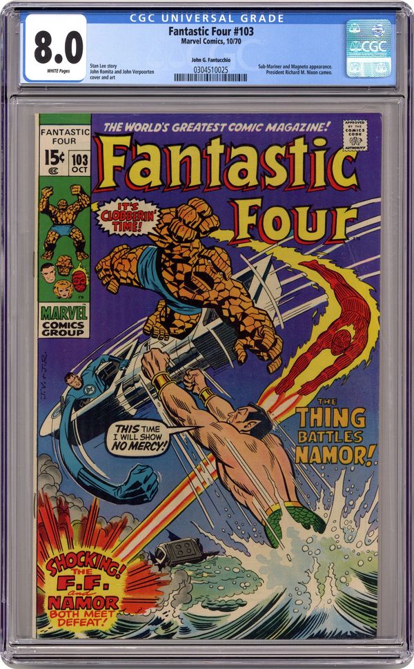 Ended May 13 2020 Winning Bid $61 "At War with Atlantis!" 2/3. Guest-starring the Sub-Mariner. Script by Stan Lee. Pencils by John Romita. Inks by John Verpoorten. Cover by John Romita and John Verpoorten. The Avenging Son is in all-out attack mode as Atlantis' invasion fleet prepares to strike New York City! And the Master of Magnetism is at Namor's side pushing him into battle! Meanwhile at the Baxter Building, Mr. Fantastic contacts the White House asking for a chance to negotiate with the Sub-Mariner before the U.S. military responds. The president grants Reed Richards' request, so the Thing, Human Torch, and Mr. Fantastic head out to sea to confront the Prince of Atlantis! It's another awesome slugfest between the Sub-Mariner and the Fantastic Four! But while the fight rages in the ocean, Magneto commandeers Namor's flagship and puts his own plans of conquest into motion! Cameo appearances by President Richard Nixon, Lady Dorma, Agatha Harkness, and Franklin. 36 pages Cover price $0.15. Grade: CGC 8.0 explanation of grade Condition: Used (collectible)