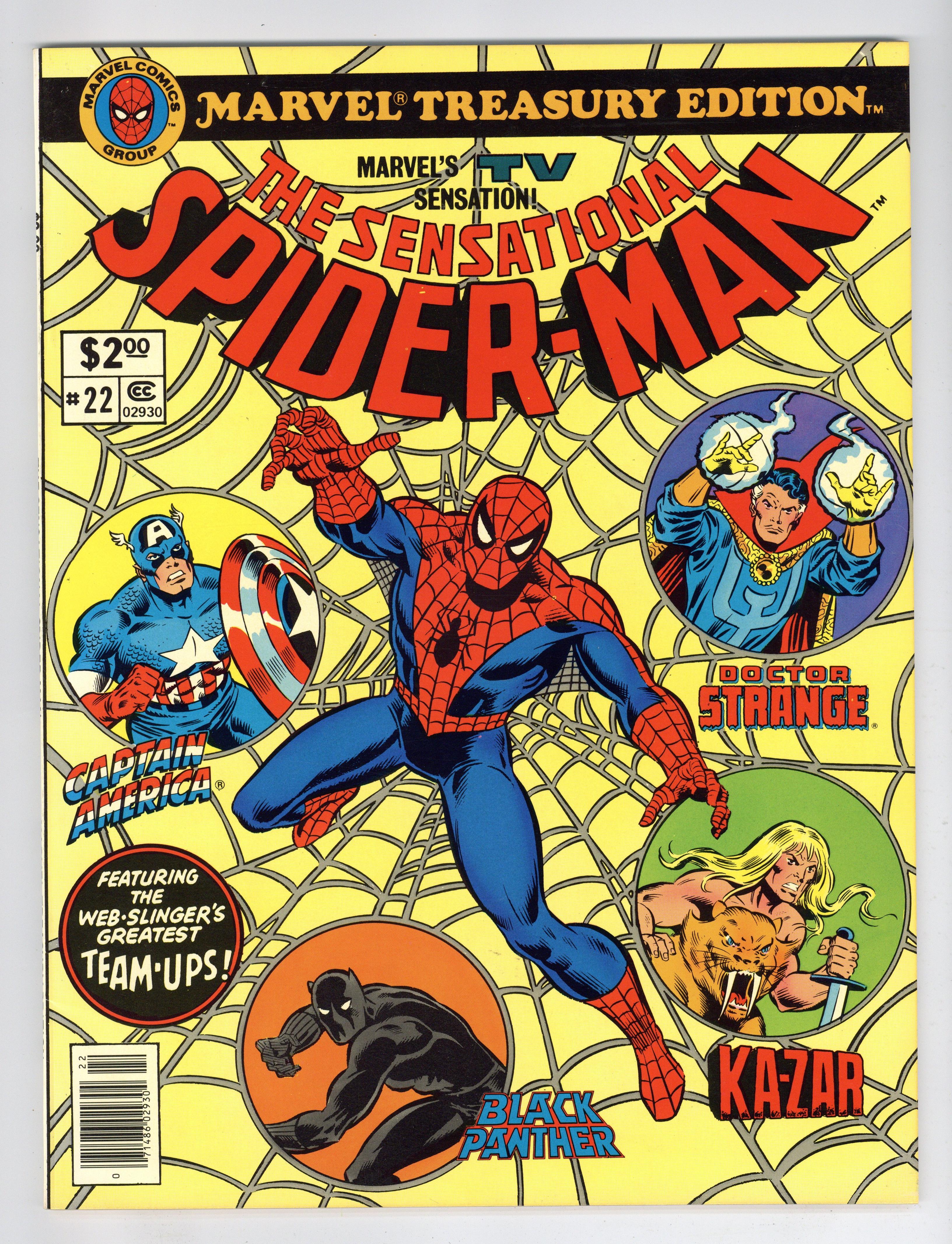Ended May 11 2020 Winning Bid $56 Marvel Treasury Edition (1974) #22 features Marvel's TV sensation the Sensational Spider-Man. This issue features some of Spidey's greatest team-ups including "The Spider and the Sorcerer" (Reprints Marvel Team-Up #21) by Len Wein, Sal Buscema, Frank Giacoia, and Dave Hunt, "The Coming of Stegron the Dinosaur Man" (Reprints Marvel Team-Up #19) by Len Wein, Gil Kane, and Frank Giacoia, " Dinosaurs on Broadway" (Reprints Marvel Team-Up #20) by Len Wein, Sal Buscema, Frank Giacoia, and Mike Esposito, and "The Granite Sky" (Reprints Marvel Team-Up #13) by Len Wein, Gil Kane, and Frank Giacoia. Guest-starring Doctor Strange, Ka-Zar, Black Panther, Nick Fury, and Captain America and featuring the villainy of Xandu, Stegron, and the Grey Gargoyle. 80 pages. Cover price $2.00. Grade: NM- 9.2 explanation of grade Condition: Used (collectible)
