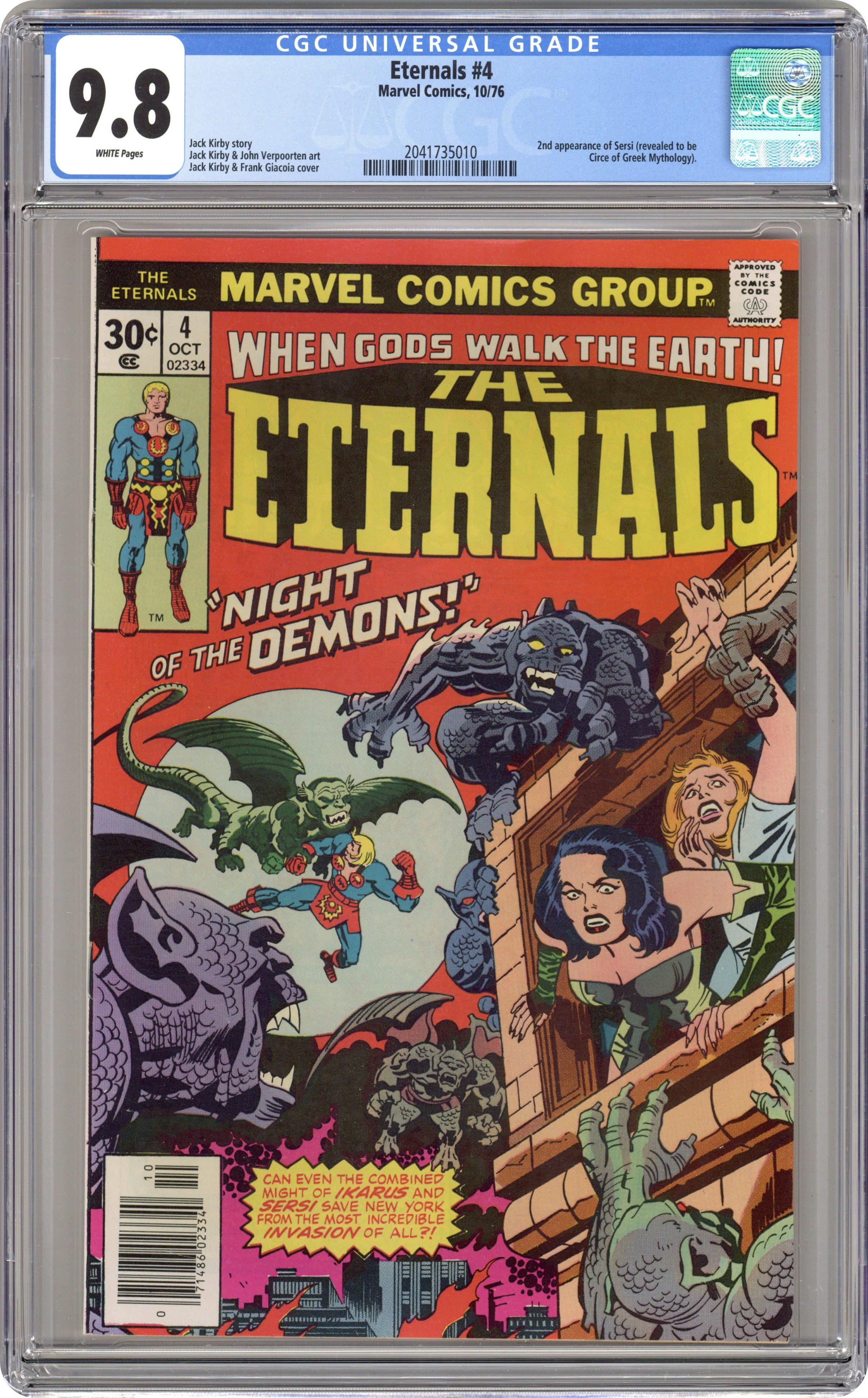 "The Night of the Demons!" Written by Jack Kirby. Pencils by Jack Kirby. Inks by John Verpoorten. Vampires, werewolves, devils and demons...! What if they were real? They are! The creatures and monsters of myth and legend are known as Deviants, a demonic race sworn to the destruction of the Eternals and their cousins, man. Can even the combined might of Ikaris and Sersi save New York City from the most incredible and monstrous invasion of all? Note: 1st appearance the Celestial Gammenon the Gatherer. Cover price $0.30. Grade: CGC 9.8 explanation of grade Condition: Used (collectible)