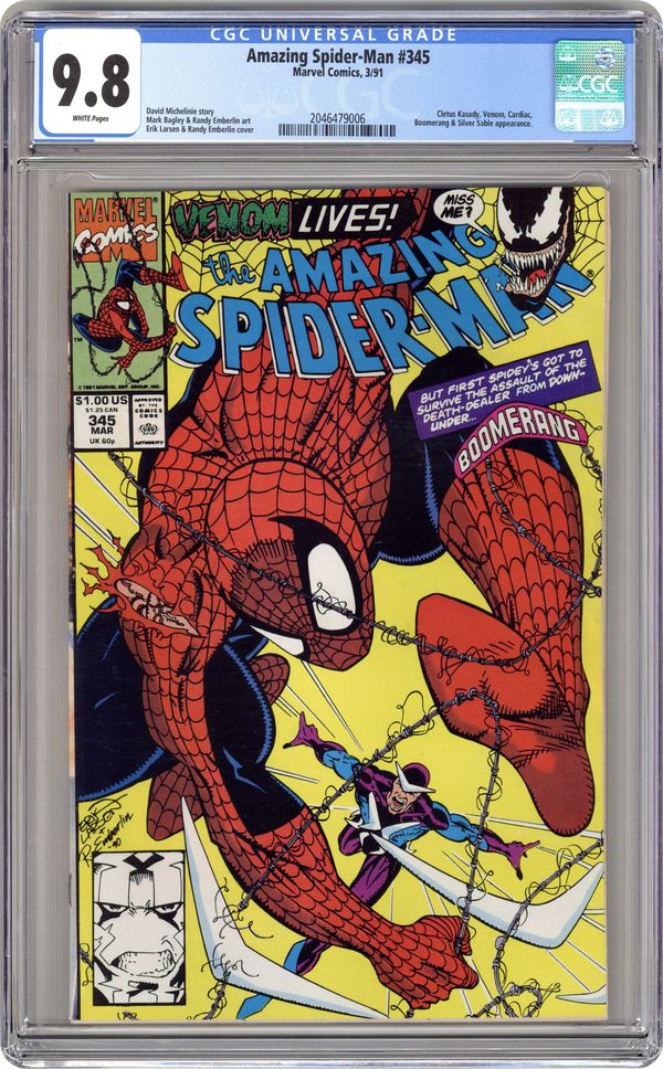 Ended May 11 2020 Winning Bid $70 Direct Edition. Cover pencils by Erik Larsen, inks by Randy Emberlin. Second appearance of Cletus Kasady (Carnage) in "Gun From the Heart!" Script by David Michelinie, pencils by Mark Bagley, inks by Randy Emberlin; Through Silver Sable (and without his knowledge of who the real boss is), Justin Hammer hires Spidey to take down Cardiac and then hires Boomerang to take down Spidey; Eddie Brock is freed from prison by the Venom symbiote, but as he leaves his cell, a little drip from the costume stays behind to keep Cletus Kasady company; Venom cameo. The letters page has a statement of ownership--average print run 489,589; average paid circulation 334,893. 36 pgs., full color. Cover price $1.00. Grade: CGC 9.8 explanation of grade Condition: Used (collectible)