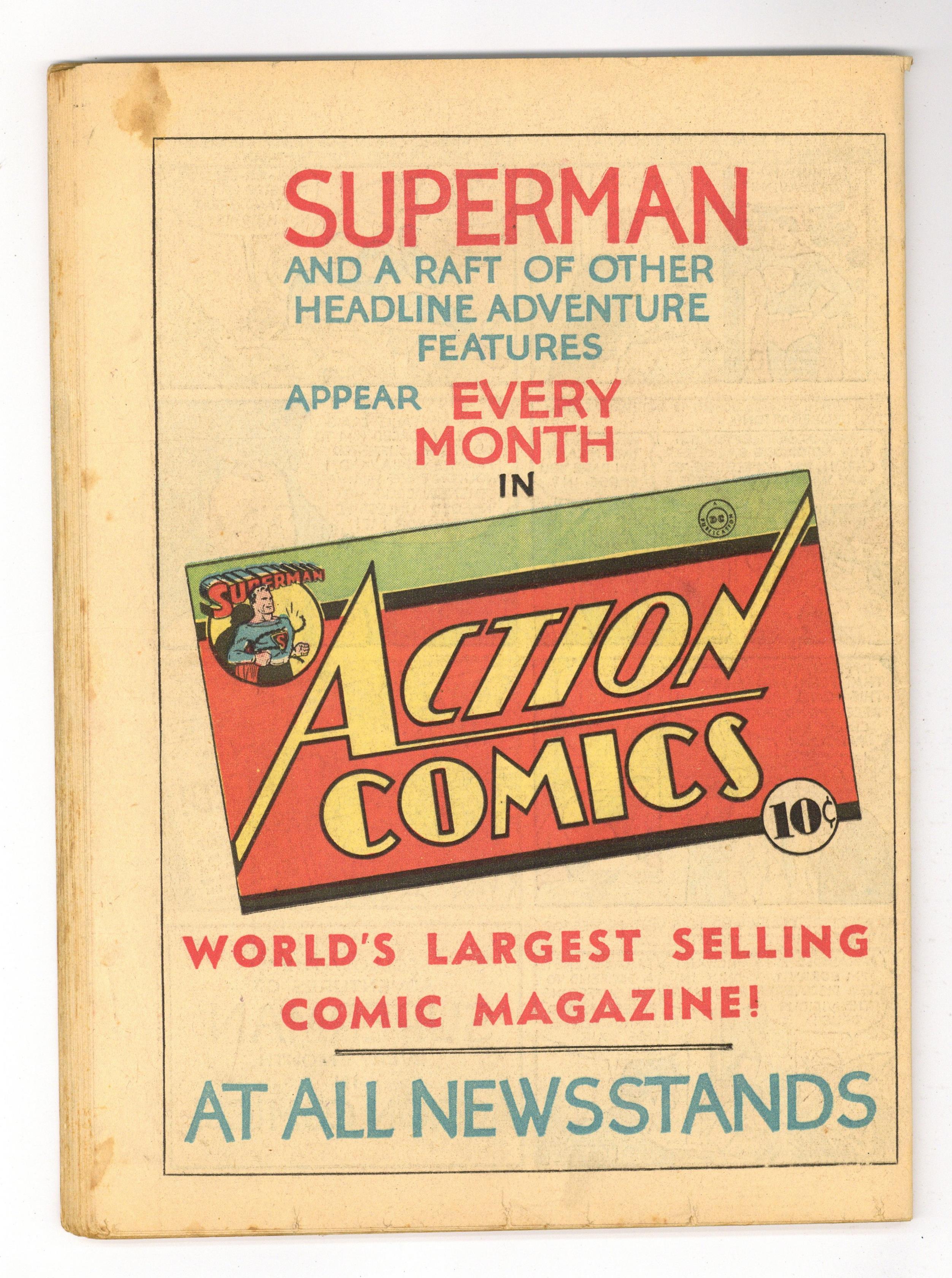 Ended Jan 21 2020 Winning Bid $235 Cover pencils by Wayne Boring. Untitled Superman story, script by Jerry Siegel, pencils by Paul Cassidy (pages 1-8) and Wayne Boring (pages 9-13) [as Joe Shuster], inks by Paul Cassidy (pages 1-8) and Paul Lauretta (pages 9-13) [as Joe Shuster]; Lois and Clark are very concerned when they see business owners trying to induce children into their stores to play slot machines, placed there by the goons of "Slug" Kelly. Superman's Super Strength: Rules for Summer Living. Supermen of America club info. Untitled Superman story, script by Jerry Siegel, art by Paul Cassidy; Punk politician Alex Evell, because of his growing political power, is out to buy the Planet's competitor, so that he will have a newspaper to back up his political dealings. Power of the Press text story, script by George Shute, art by Bernard Baily. Untitled Superman story, script by Jerry Siegel, pencils by Joe Shuster, inks by Wayne Boring [as Joe Shuster]; Clark Kent smells a rat when he enters several offices of financial wizards, hoping to find out why they are profiting during a time of extreme depression. Murder In the Wind text story by Jack Wallis. Two half-page ads for All-Star Comics #1 and Batman #1. Untitled Superman story, script by Jerry Siegel, art by Paul Cassidy; Superman investigates why a noted chemist's serum, parabiolene, financed by a noted gangster named Carlin, is being used on noted people, making them virtual slaves to do the bidding of Carlin. Promotional ad for Action Comics. 68 Pages, Full Color. Cover price $0.10. Grade: Coverless explanation of grade Condition: Used (collectible)