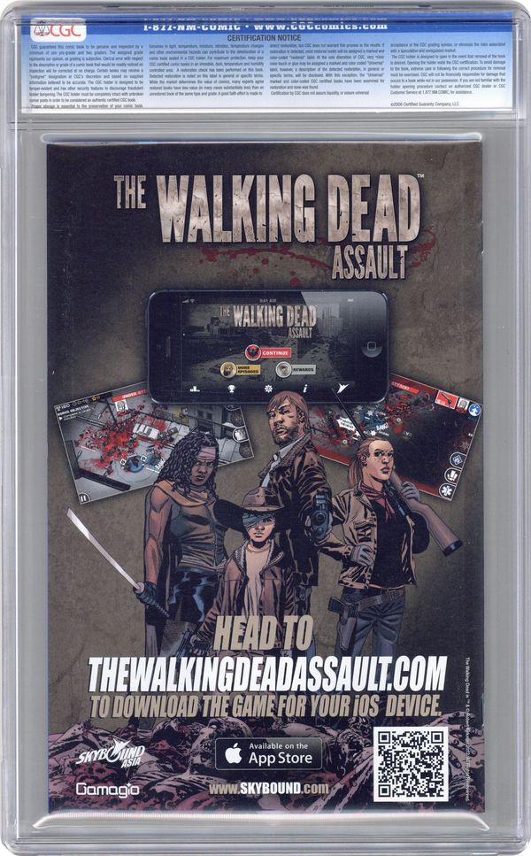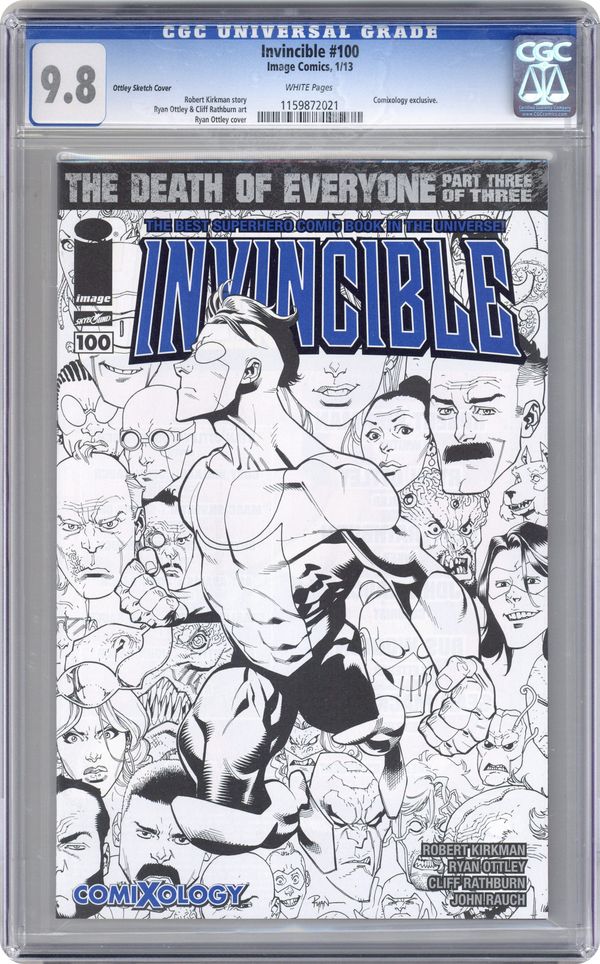 Comixology Exclusive Black and White Variant Limited to 500 copies. Cover by Ryan Ottley Death of Everyone: Part 3 of 3 - (W) Robert Kirkman (A) Ryan Ottley, John Rauch 10th ANNIVERSARY LANDMARK 100 th ISSUE SPECTACULAR! THE DEATH OF EVERYONE: CONCLUSION! It's all been building to this. Mark Grayson's entire life as a superhero, all he's learned, all he's endured, it's all been leading to this one moment. Will he become the hero he was meant to or will he choose... a DIFFERENT path? The aftermath of this EXTRA-SIZED issue will shock you. Grade: CGC 9.8 explanation of grade Condition: Used (collectible)