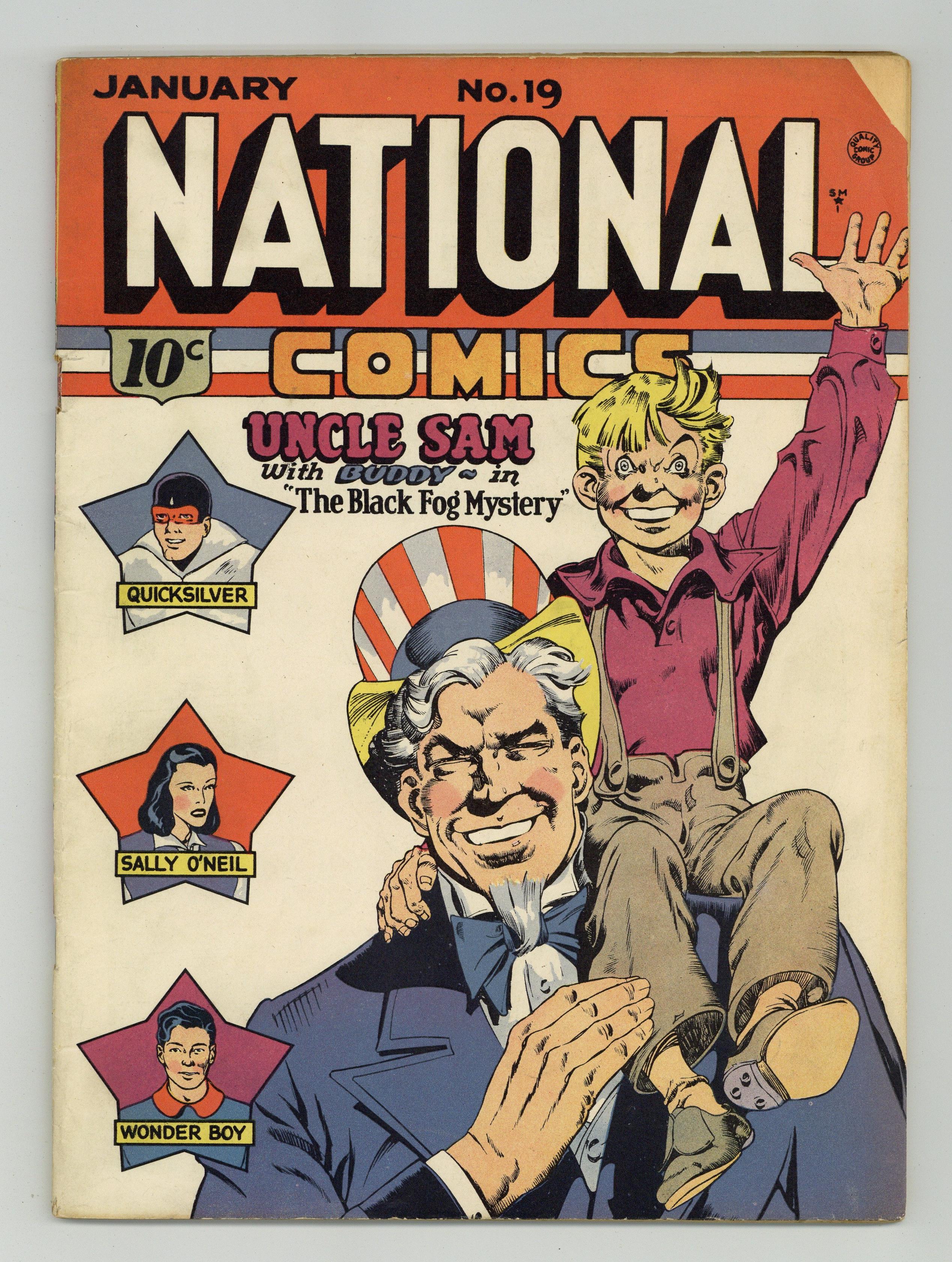 Ended May 24 2020 Winning Bid $150 Cover art by Reed Crandall. The Black Fog Mystery starring Uncle Sam, art by Lou Fine. Untitled stories starring Sally O'Neil Policewoman (art by Frank Kearns), Kid Dixon (art by Bob Reynolds), Windy Breeze (script and art by Jack Cole), Wonder Boy (art by Nick Cardy), Quicksilver (art by Nick Cardy), Jack and Jill (art by John Cassone), Prop Powers (art by Lynn Bird), Pen Miller (script and art by Klaus Nordling), Paul Bunyan (art by Story Weaver), and Merlin the Magician (script and art by Fred Guardineer). Dog Ketchers starring Kid Patrol, art by Don Wilson. 68 pgs. $0.10. Cover price $0.10. Grade: VG 4.0 explanation of grade Condition: Used (collectible)