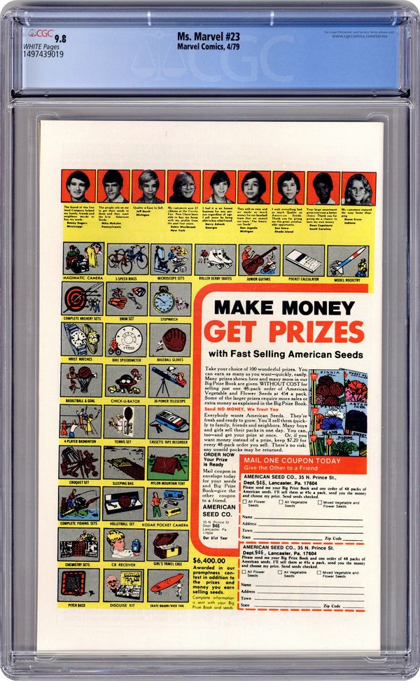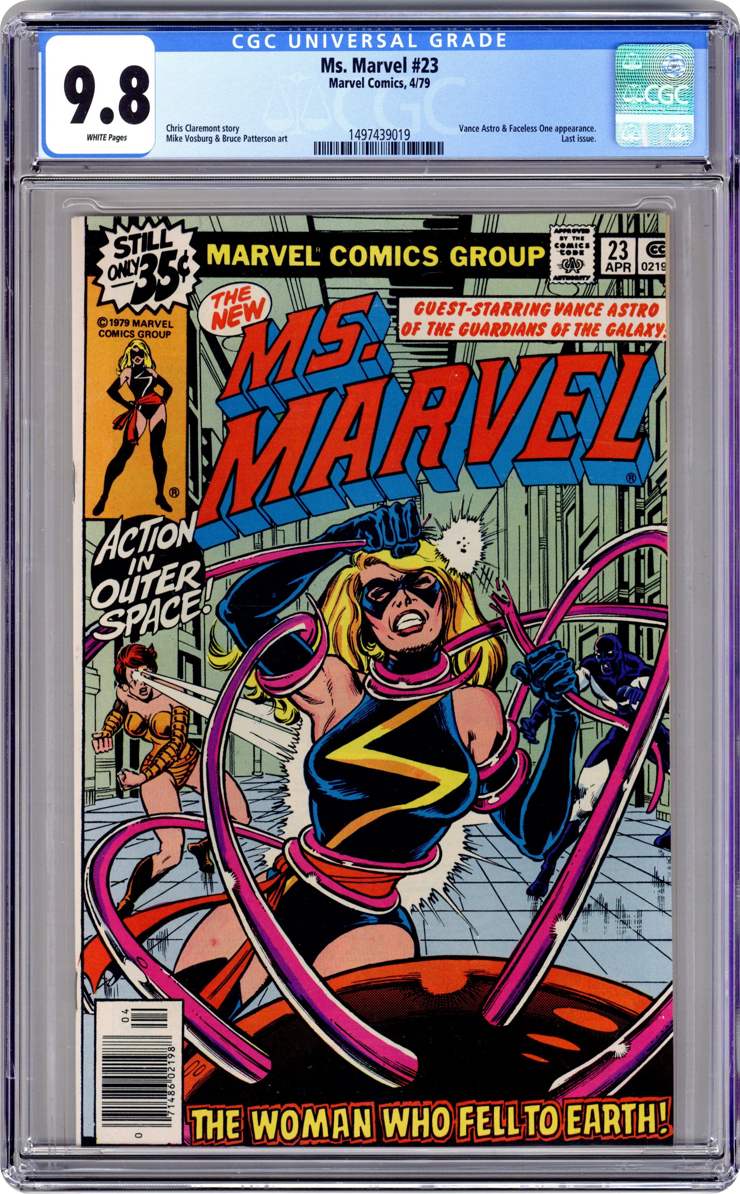 Final issue? See the 1990's title Marvel Super Heroes # 10 & 11 for issues # 24 & 25. George Perez and Joe Rubinstein cover. Chris Claremont script. Mike Vosburg & Bruce Patterson art. "The Woman Who Fell To Earth" Ms. Marvel and Vance Astro of the Guardians of the Galaxy vs. The Faceless One who was last seen in Astonishing Tales #2, (next appearance Avengers #183). Cover price $0.35. Grade: CGC 9.8 explanation of grade Condition: Used (collectible)