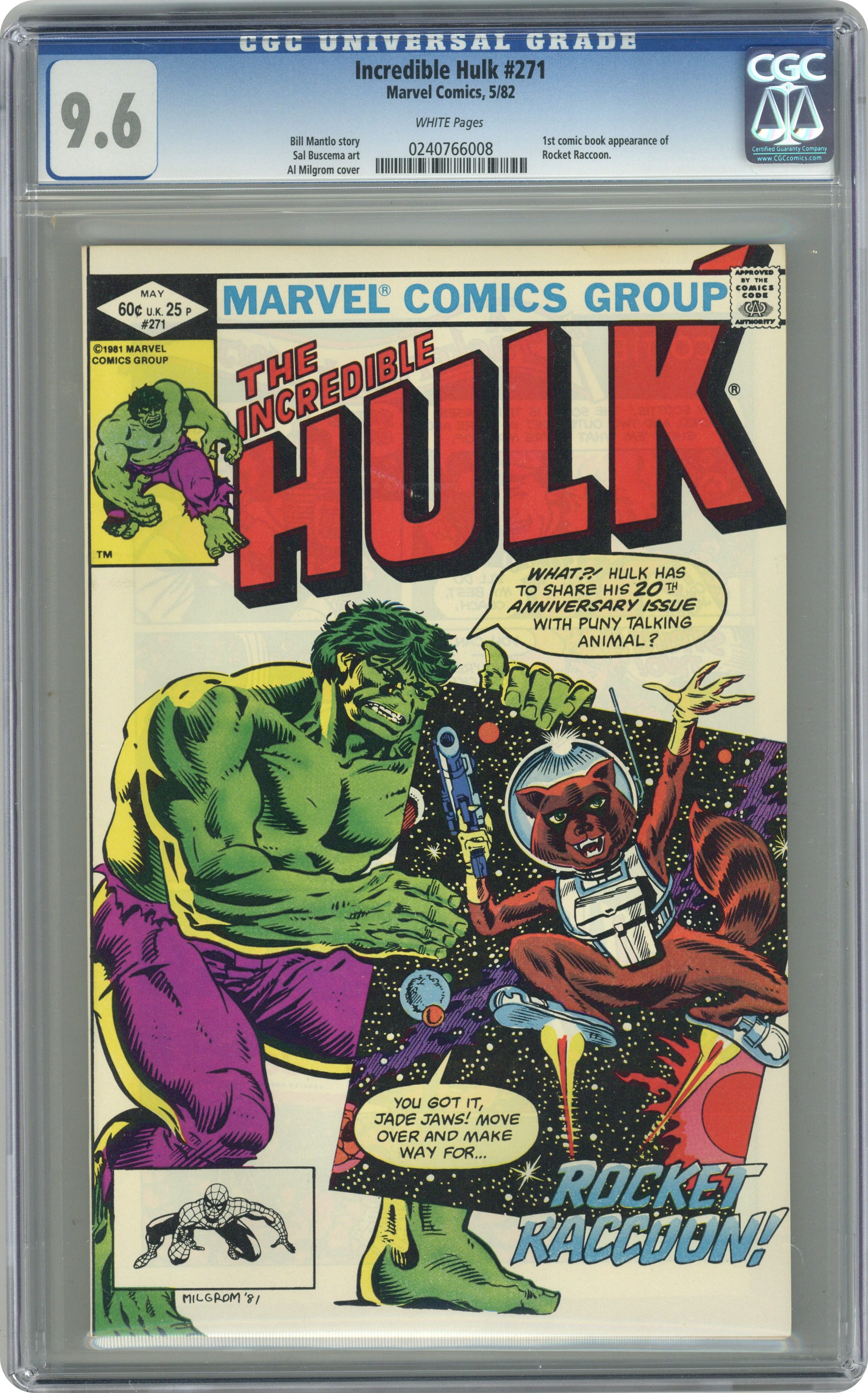 Ended May 9 2020 Winning Bid $255 Newsstand Edition. 2nd appearance of Rocket Raccoon (see Marvel Preview #7 for 1st appearance). Story by Bill Mantlo. Art by Sal Buscema. The Hulk celebrates his 20th Anniversary with one of the most offbeat stories of all. Following the events of last issue, Hulk hurtles through the void only to run into the marvelous Rocket Raccoon and his band of colorful friends. Can the Hulk aid Rocket and his crew against the machiavellian Judson Jakes and his sinister scientist, the tortoise Uncle Pyko? 36 pages. Cover price $0.60. Grade: CGC 9.6 explanation of grade Condition: Used (collectible)