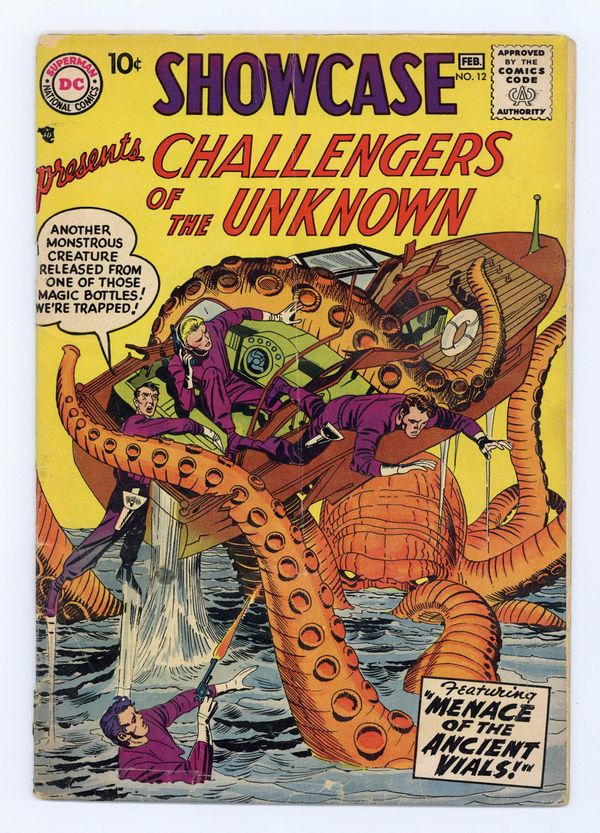 Ended May 8 2020 Winning Bid $133 Cover by Jack Kirby. "Menace of the Ancient Vials!", script by Dave Wood, art by Jack Kirby; While chasing the criminal known as Karnak, the Challengers and their prey end up flying into a strong lightning storm, forcing both parties to land; Karnak finds a manor owned by an archeologist who had just discovered the ancient vials of a long dead society, each vial able to unleash a different magical effect; Karnak and his companion steal the vails and use them to battle the Challengers. Professor Eureka strip by Henry Boltinoff. 36 Pages, Full Color. Cover price $0.10. Grade: GD 2.0 explanation of grade Condition: Used (collectible)