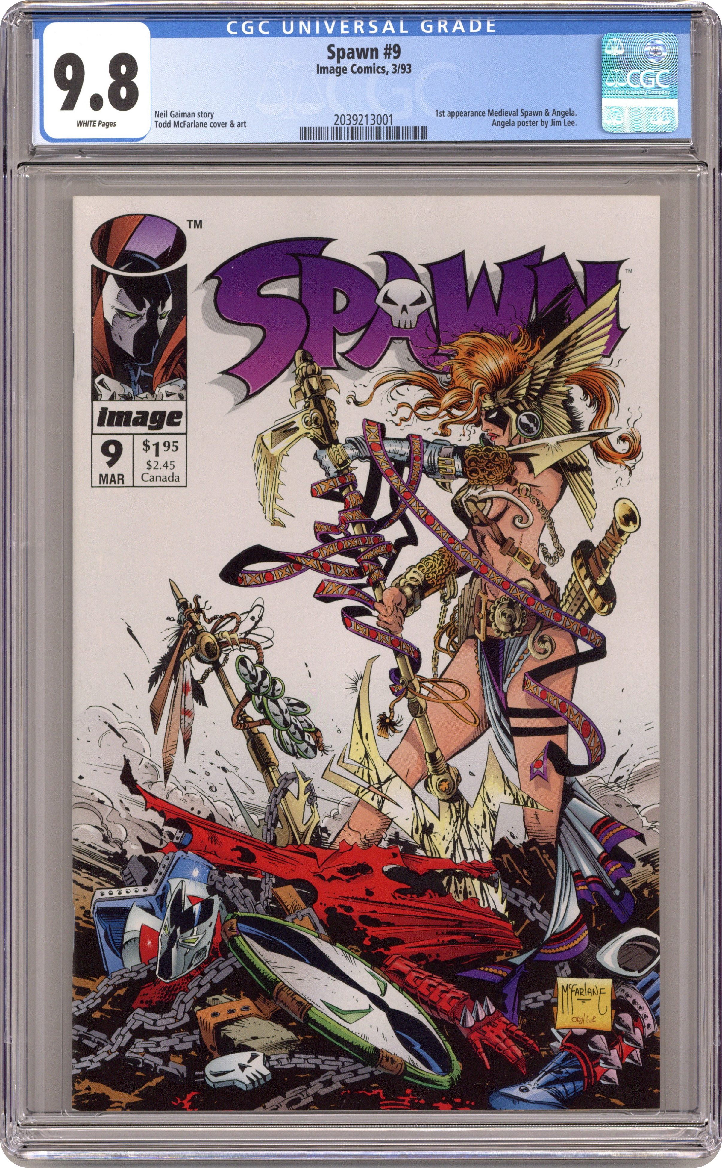 Ended May 7 2020 Winning Bid $76 Direct Edition. "Angela!" 1st appearance of Angela, Cagliostro, and Medieval Spawn. Story by Neil Gaiman. Art by Todd McFarlane. Spawn is attacked by Angela, a warrior of Heaven who has been hunting Hellspawns for centuries. Includes a B&W poster of Angela by Jim Lee and Todd McFarlane. Cover price $1.95. Grade: CGC 9.8 explanation of grade Condition: Used (collectible)