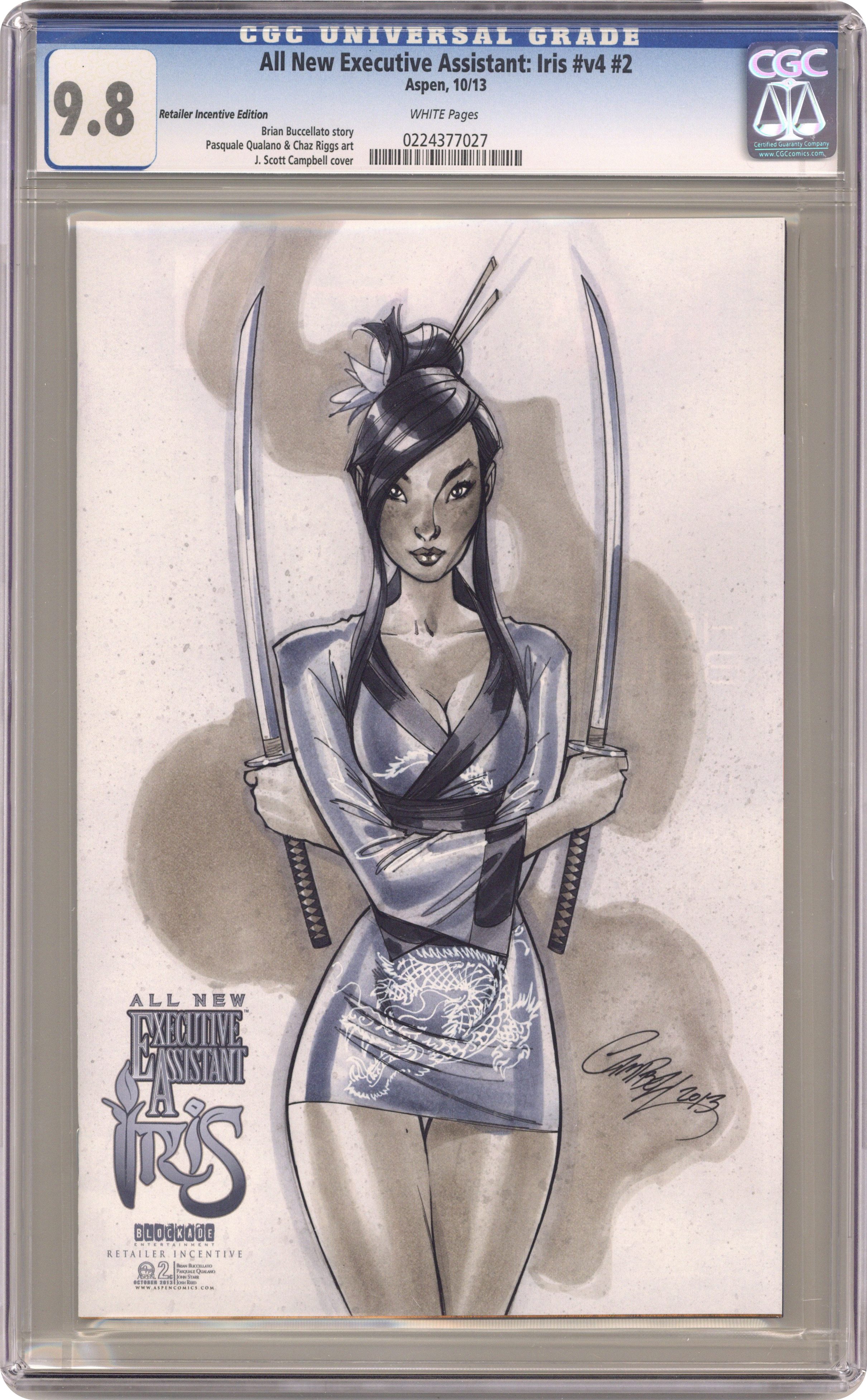 Ended May 22 2020 Winning Bid $65 Limited 1 for 16 Variant Cover by J.Scott Campbell (W) Steve Buccellato (A) Pasquale Qualano It's an all-new direction for the Executive Assistant that started it all! Shao and his cadre of armed mercenaries confront Iris and Maly, but the true conflict is not found in their present-but, in their past. The brutal sacrifice of Maly's actions many years ago have now come back to haunt her, and force Iris to make a decision she's not entire comfortable making. A decision that could be extremely dangerous for her future! Aspen is proud to welcome writer Brian Buccellato and penciler Pasquale Qualano to the Iris family! Along with colorist John Starr, this incredible creative team is ready to bring you an ALL NEW EXECUTIVE ASSISTANT IRIS unlike anything you've ever seen before! Cover price $3.99. Grade: CGC 9.8 explanation of grade Condition: Used (collectible)
