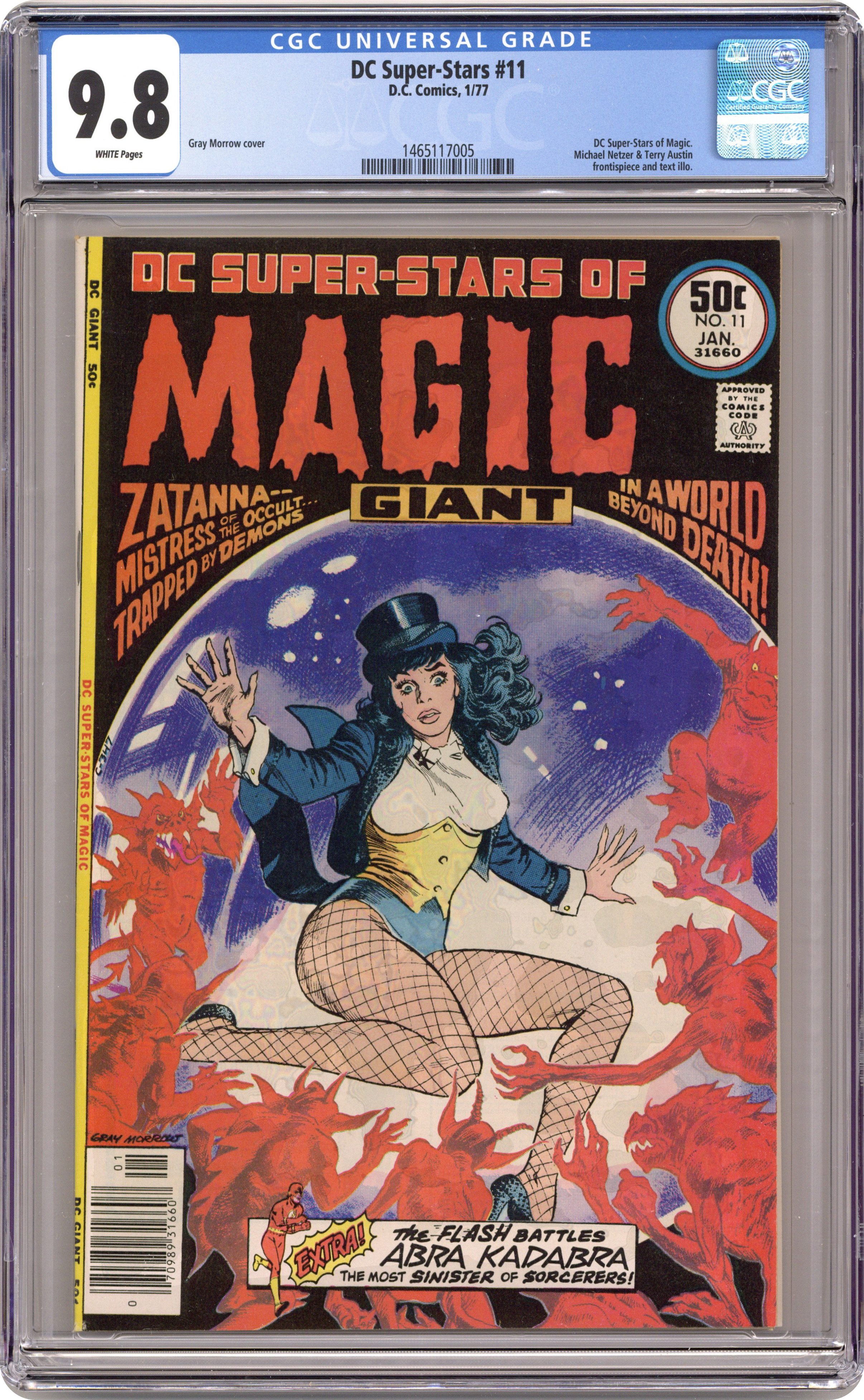 Ended May 6 2020 Winning Bid $595 DC Super-Stars of Magic. Zatanna -- mistress of the occult -- trapped by demons in a world beyond death! Plus: The Flash battles Abra Kadabra, the most sinister of sorcerers! Featuring: 1 page DC Super-Stars of Magic story "Contents" written by Carl Gafford and drawn by Michael Netzer (as Mike Nasser) & Terry Austin; 17 page Zatanna reprint story "Zatanna the Magician" written by Len Wein and drawn by Gray Morrow; 1 page text article "The Great Houdini" written by Carl Gafford and drawn by Michael Netzer (as Mike Nasser) & Terry Austin; 1 page text article "Conjuring through the Ages" written by Carl Gafford; 13 page Flash (Barry Allen) reprint story "The Case of the Real-Gone Flash" written by John Broome and drawn by Carmine Infantino & Joe Giella; 1 page Magic Tricks You Can Do activity "The Coin in the Glass" by Carl Gafford and Vince Colletta; 1 page Magic Tricks You Can Do activity "The Disappearing Coin" by Carl Gafford and Vince Colletta; 1 page Magic Tricks You Can Do activity "The Magical Prediction" by Carl Gafford and Vince Colletta. Cover by Gray Morrow. Cover price $0.50. Grade: CGC 9.8 explanation of grade Condition: Used (collectible)