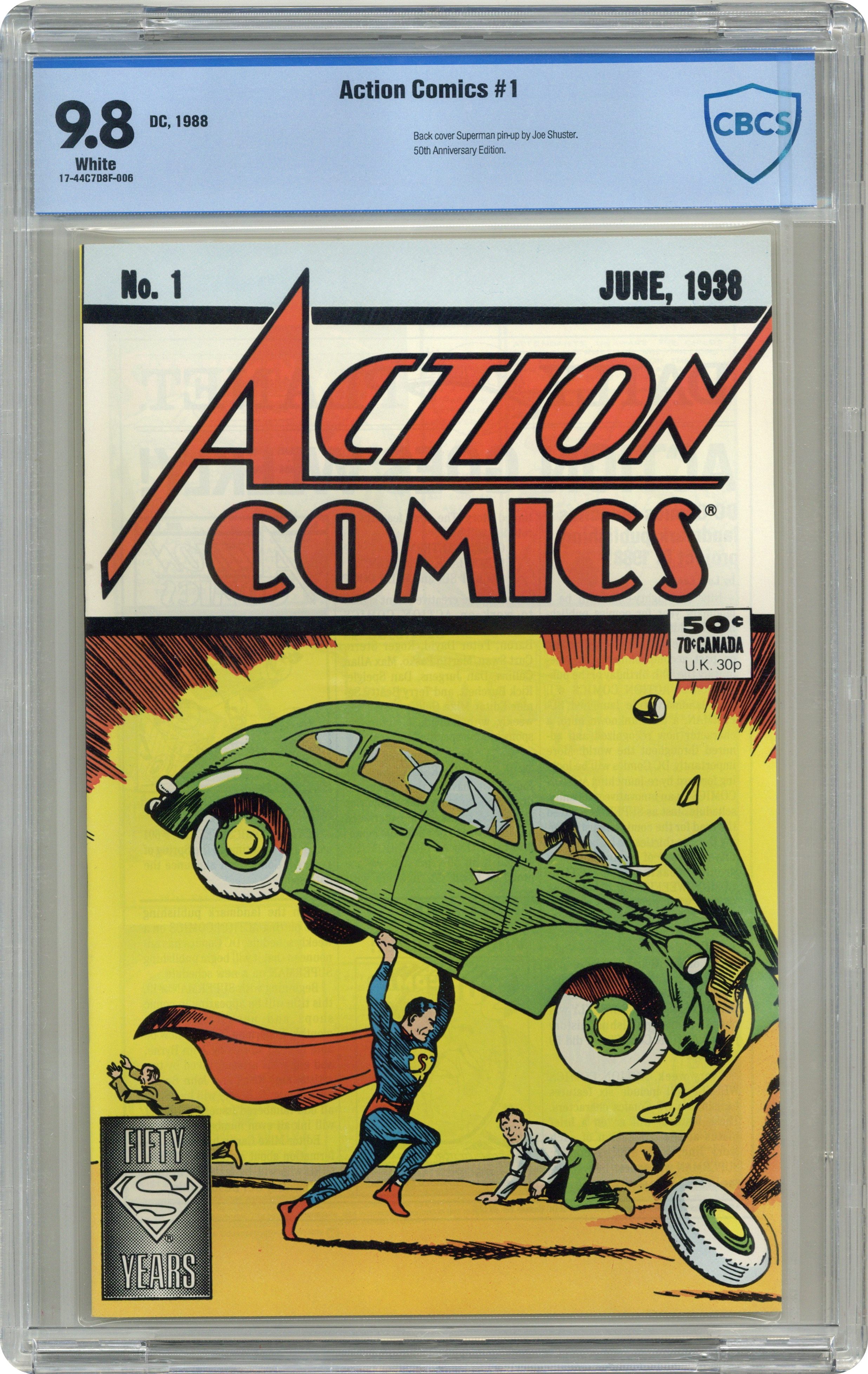Ended Oct 15 2020 Winning Bid $106 Direct Sales Edition. 16-page reprint of Action #1. 1988 reprint 50 cent cover price. Cover price $0.50. Grade: CBCS 9.8 explanation of grade Condition: Used (collectible)