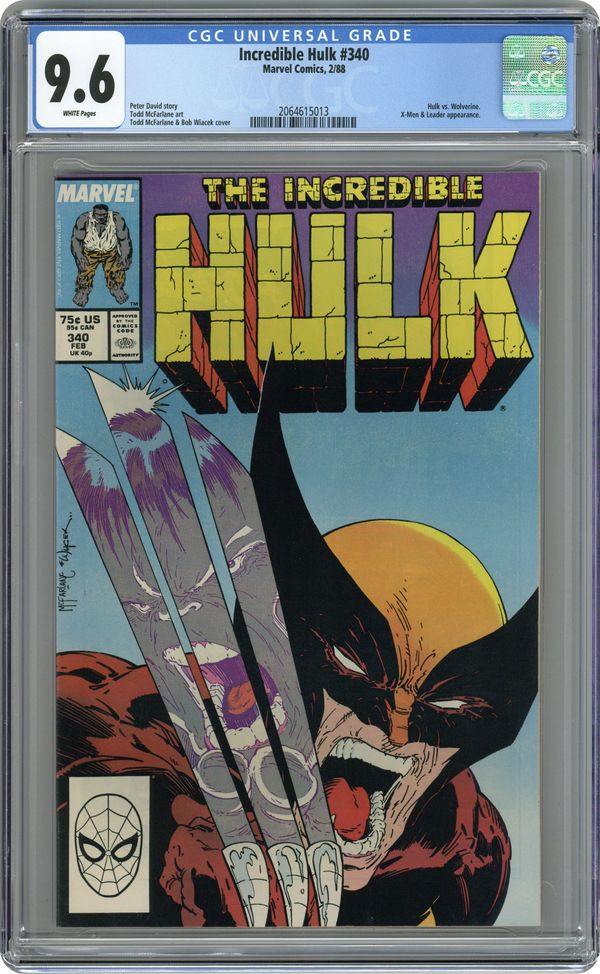 Ended May 6 2020 Winning Bid $172 Direct Edition. Fall of the Mutants crossover. "Vicious Circle!" Guest-starring Wolverine. Uncanny X-Men cameo. Story by Peter David. Art by Todd McFarlane. The Canadian mutant and the Incredible Hulk have never had a friendly relationship. This is their second and arguably most vicious battle to date. As the X-Men make their way to their ultimate fate at Forge's tower in Dallas (also see Uncanny X-Men #225-227), Wolverine separates from the group to confront a familiar scent. Before the Canuckle-Head can explain that he's not here for a fight, the Hulk, who hasn't forgotten their last meeting, attacks. 36 pgs. Cover price $0.75. Grade: CGC 9.6 explanation of grade Condition: Used (collectible)