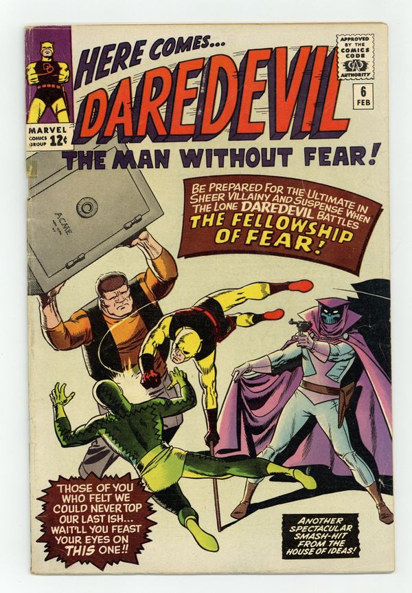 Ended Jul 18 2020 Winning Bid $75 Cover art by Wally Wood. First appearance of Mr. Fear in "Trapped by the Fellowship of Fear!" Script by Stan Lee, art by Wally Wood. The Fellowship of Fear includes Mr. Fear, the Ox, and the Eel. Cameos (Mr. Fear's sculptures) by Captain America, Electro, the Owl, Rama-Tut, Mysterio, Spider-Man, the Chameleon, Dr. Doom, the Hatemonger, Diablo, the Beetle, Kraven, Baron Zemo, Iron Man, the Toad, Mr. Doll, the Black Knight, Egghead, the Hulk, the Melter, Cyclops, the Vulture, the Thing (of the Fantastic Four), Dr. Octopus, Dr. Strange, Loki, Thor, the Super Skrull, the Cobra, Magneto, Giant Man, and the Green Goblin!; DD intrudes on a phony movie shoot where the Fellowship of Fear is robbing a bank and gets himself blasted by fear gas; Mr. Fear decides to flush DD out by creating a wax figure of Hornhead for his museum; DD and Foggy both get in a brawl with the Fellowship, and Foggy is injured; DD returns to the wax museum to put an end to the Fellowship. 36 pgs. Cover price $0.12. Cover price $0.12. Grade: VG 4.0 explanation of grade Condition: Used (collectible)