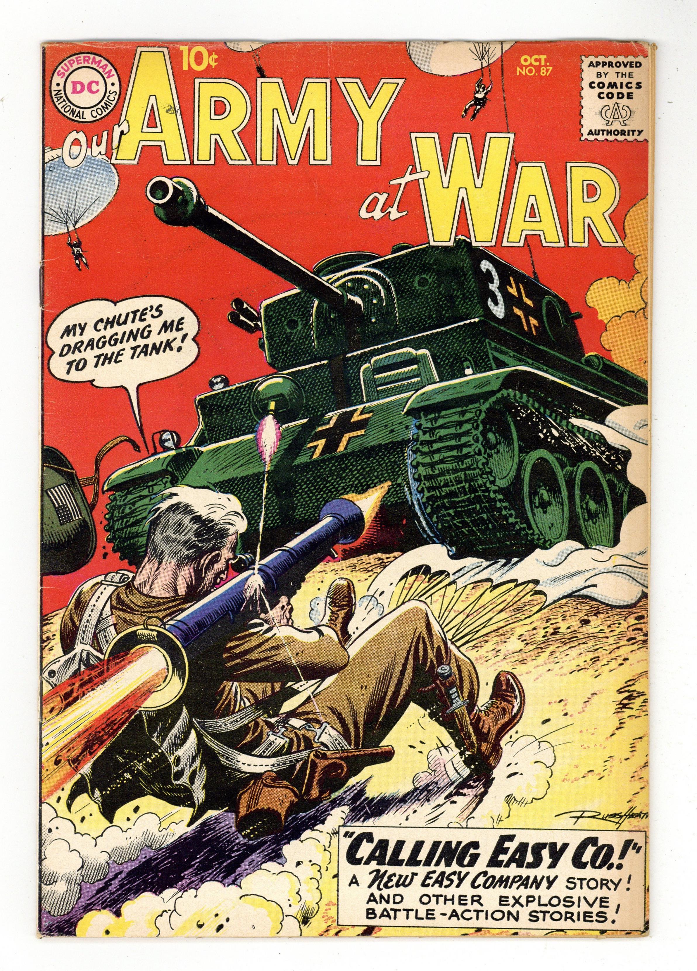 Ended May 6 2020 Winning Bid $97 Cover art by Russ Heath. Calling Easy Co.! starring Sgt Rock, script by Bob Kanigher, art by Joe Kubert. Tiger Twister, script by Bob Haney, art by Mort Drucker. Worm's-Eye War, script by Bob Haney, art by Russ Heath. 36 Pages, Full Color. Cover price $0.10. Grade: VG 4.0 explanation of grade Condition: Used (collectible)