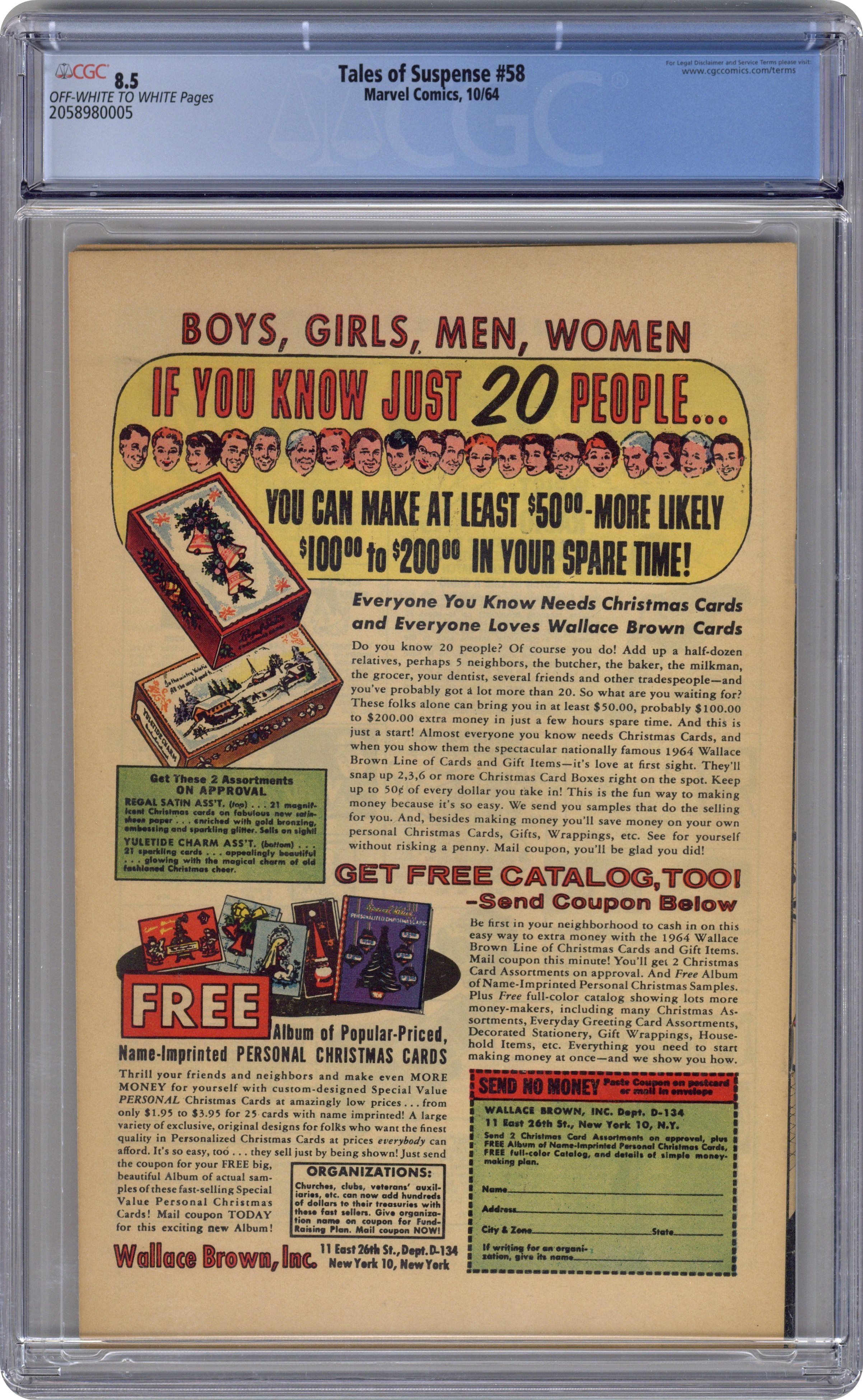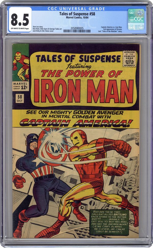 Ended May 6 2020 Winning Bid $502 Cover pencils by Jack Kirby, inks by Chic Stone. Captain America (first appearance in this title) battles Iron Man in "In Mortal Combat with Captain America!", script by Stan Lee, pencils by Don Heck and Jack Kirby, inks by Dick Ayers; The Chameleon tricks Iron Man into attacking Captain America, and the two fight until the misunderstanding is discovered; Second Kraven the Hunter appearance; Giant-Man and Wasp appearances. "The Runner!" text story. "The Watcher Must Die!", script by Stan Lee, art by George Tuska; An alien warlord attacks the Watcher, and is instantly destroyed by accelerated aging; This is the last Tales of the Watcher story in Tales of Suspense; Another series starts as a back-up in Silver Surfer (1968 series) #1. 36 pgs., full color. $0.12. Cover price $0.12. Grade: CGC 8.5 explanation of grade Condition: Used (collectible)