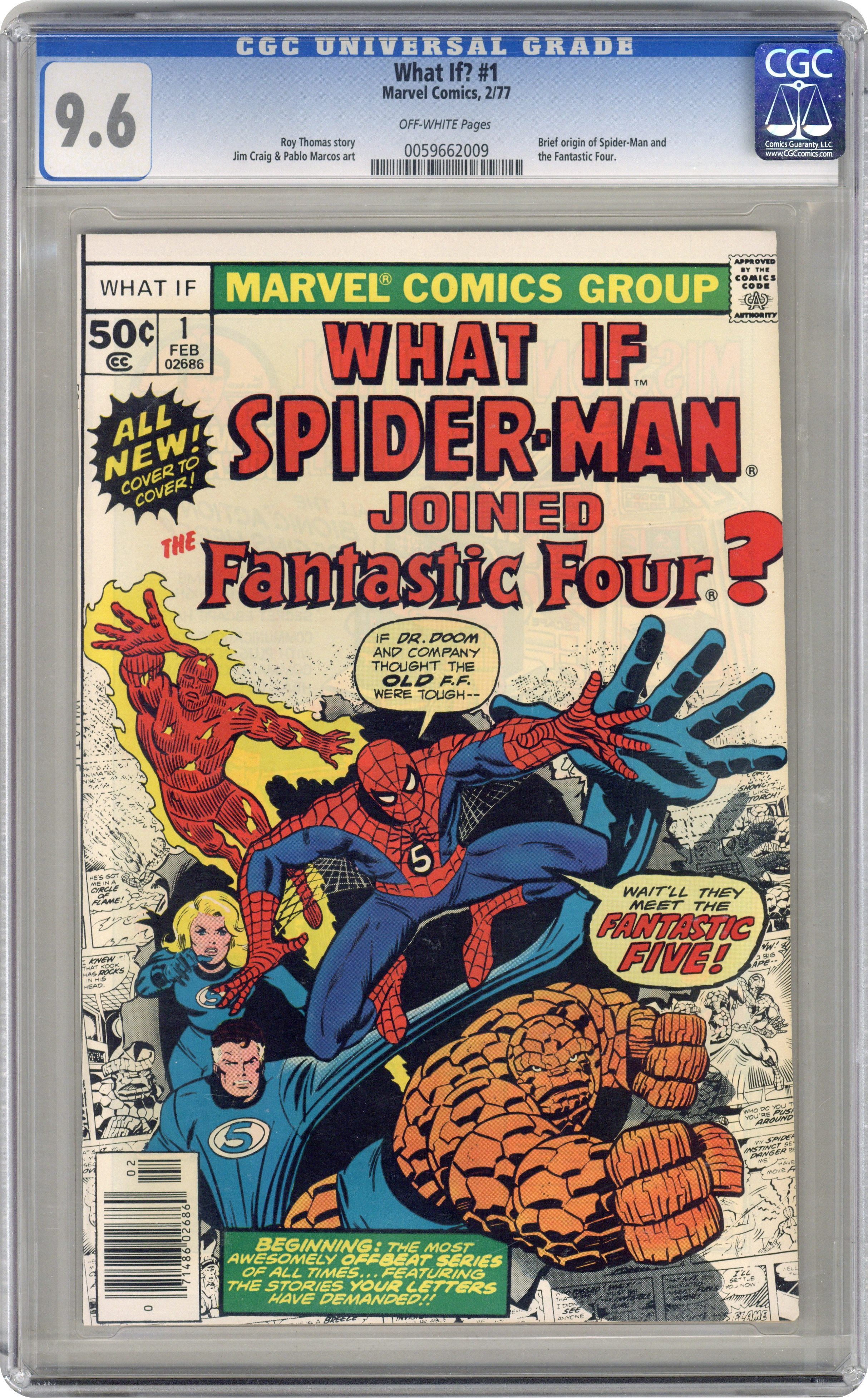 Ended May 5 2020 Winning Bid $140 Cover by Ron Wilson and Joe Sinnott. What if Spider-Man Joined the Fantastic Four? Script by Roy Thomas, pencils by Jim Craig, inks by Pablo Marcos; Spider-Man becomes a member of the FF; Cameos by Killraven, the Squadron Supreme, and Deathlok. Hostess Fruit Pie ad with the Hulk, pencils by Dave Cockrum. Ad for Richochet Racers with Spider-Man and Captain America. Roy Thomas discusses how the title came about. 52 pgs. Cover price $0.50. Grade: CGC 9.6 explanation of grade Condition: Used (collectible)