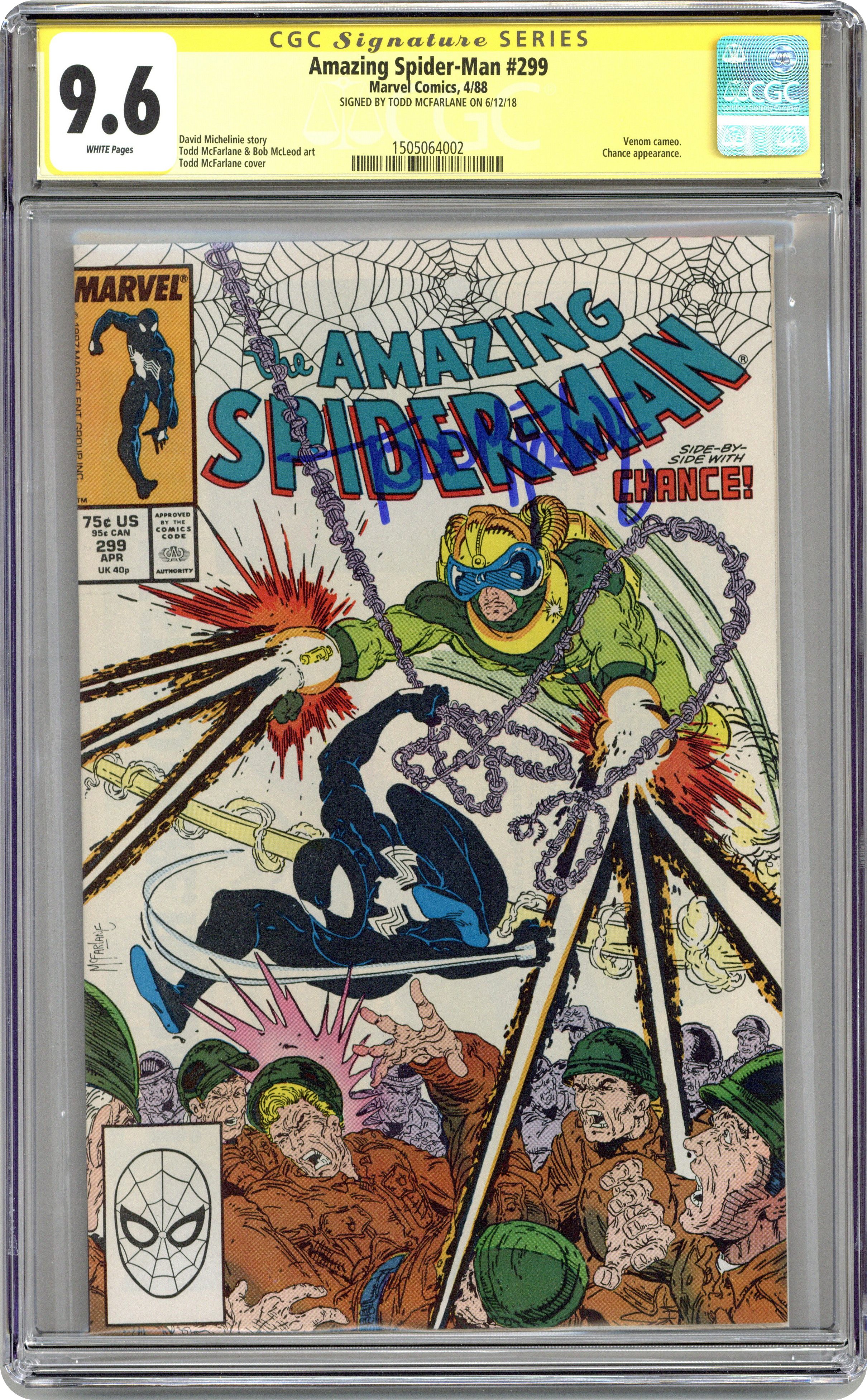 Ended May 6 2020 Winning Bid $311 Direct Edition. "Survival of the Hittist!" Part 2 of 2. Script by David Michelinie. Pencils by Todd McFarlane. Inks by Bob McLeod. Cover by Todd McFarlane. After their waterfront arms theft goes awry, the Life Foundation turns the tables on Chance! The mysterious survivalist group abducts the mercenary and takes him to their secret headquarters in northern New Jersey! But thanks to a well-placed spider tracer, the web-slinger infiltrates the foundation's secluded colony the next day...and rescues Chance! So now the adversaries of 24 hours ago suddenly become allies to avoid death...courtesy of the Life Foundation! First appearance (and cameo on the last page) by Venom. Cameo appearances by Eddie Murphy, Paul Schaffer, and Joe Robertson. Last 75ยข issue. 36 pages, full color. (Note: Chance returns in Amazing Spider-Man 336.) Cover price $0.75. Grade: CGC 9.6 explanation of grade Condition: Used (collectible)