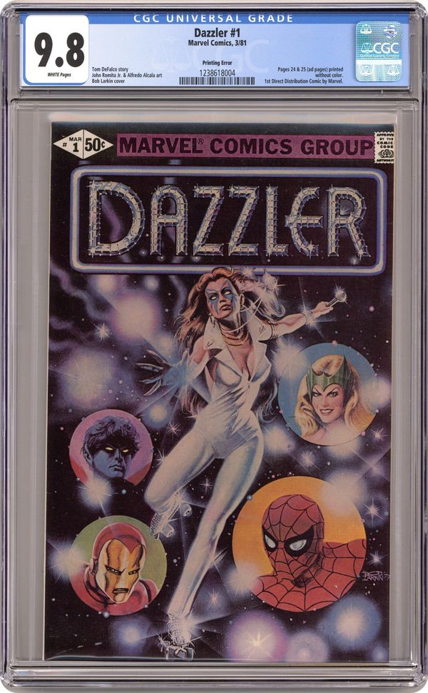 Ended May 13 2020 Winning Bid $116 Error version with pages 24 & 25 printed in black and white. Dazzler origin in "So Bright This Star." Script by Tom DeFalco, pencils by John Romite Jr., inks by Alfredo Alcala. Guest appearances by Spider-Man, the X-Men (Storm, Wolverine, Colossus, Nightcrawler, and Sprite), the Avengers (Hawkeye, the Beast, Iron Man, the Wasp, and Captain America), and the Enchantress. This issue was not sold on newsstands, but available only from direst-sale outlets. Bob Larkin painted cover. Cover price $0.50. Grade: CGC 9.8 explanation of grade Condition: Used (collectible)