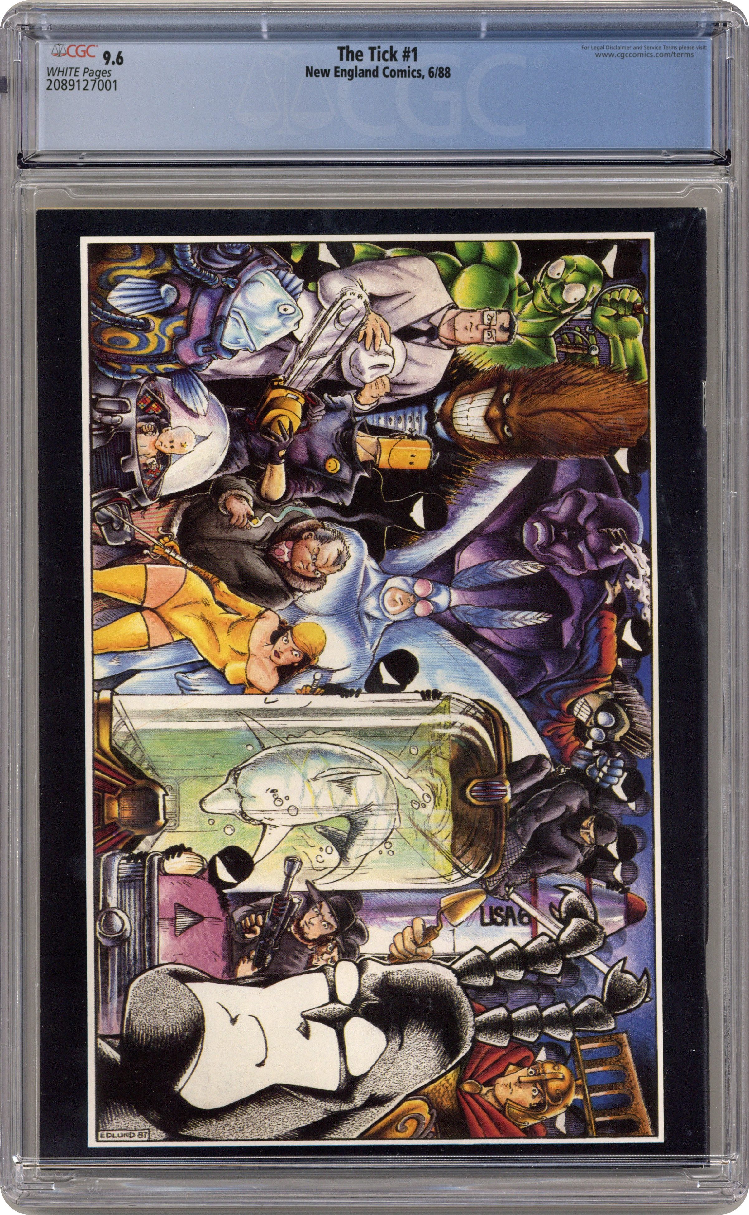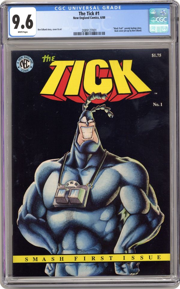 Ended Jan 15 2021 Winning Bid $186 (2nd Edition) inside cover. This is a first printing of Tick #1, but Tick #1 reprints the serially numbered Tick Special Edition (1st appearance) w/minor changes. NOTE: This is a 1st Printing. 1st printings do not have a 2nd or later printing notice in indicia. Written by Ben Edlund. Art and cover by Ben Edlund. The Tick arrives straight from the nuthouse and into The City where he decides to be a superhero; After having a tussle with ninjas and being run over by a train, he is no closer to realizing his lofty goals. One page art lesson on how to draw The Tick by Ben Edlund. 36 pgs., B&W. $1.75. Cover price $1.75. Grade: CGC 9.6 explanation of grade Condition: Used (collectible)