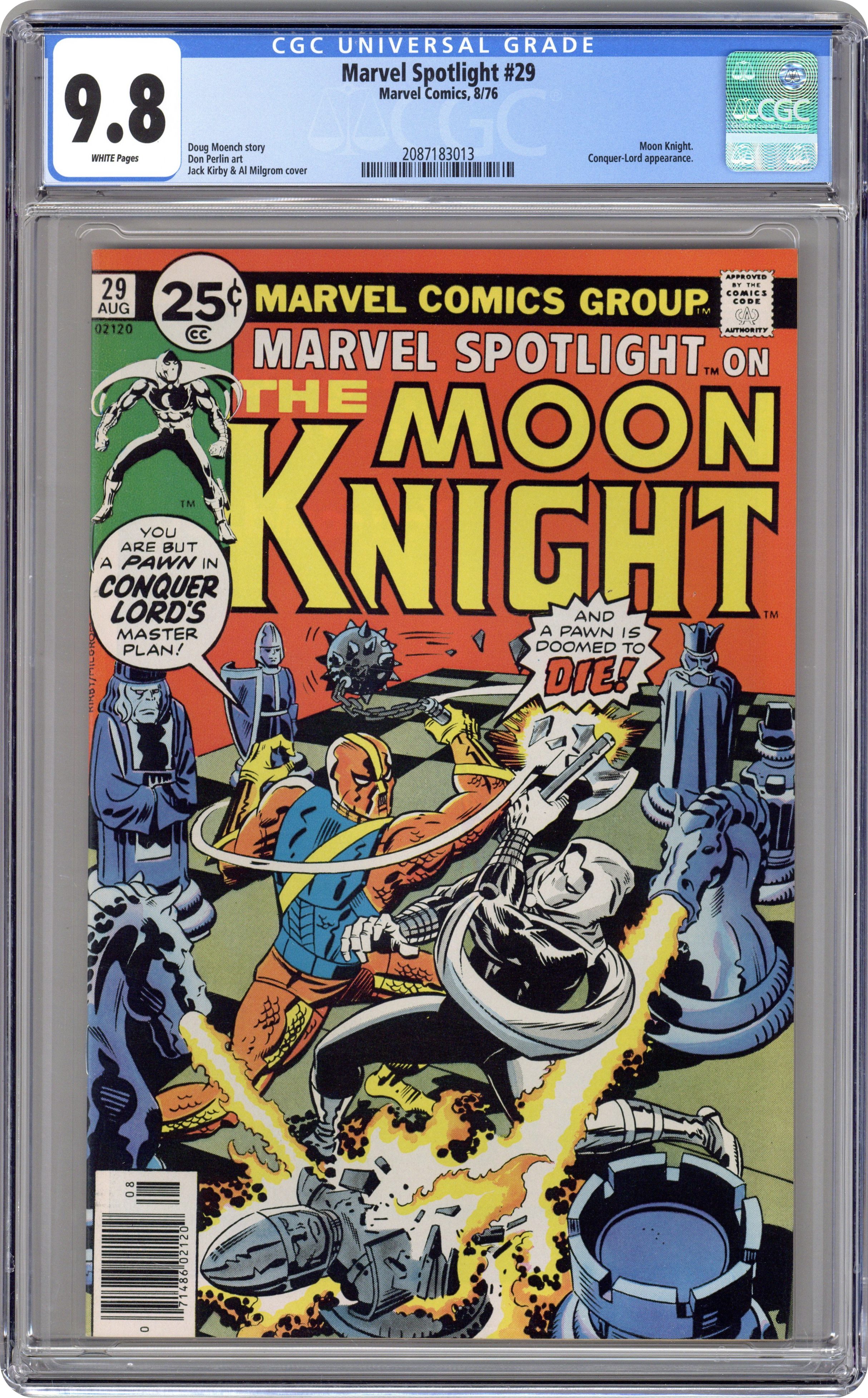 Ended May 5 2020 Winning Bid $240 Cover pencils by Jack Kirby, inks by Al Milgrom. The Deadly Gambit of Conquer-Lord!, script by Doug Moench, art by Don Perlin; Moon Knight stops Conquer-Lord from assassinating the mayor; Conquer-Lord escapes with Marlene as his hostage; Moon Knight goes after him 36 pages, full color. Cover price $0.25. Grade: CGC 9.8 explanation of grade Condition: Used (collectible)