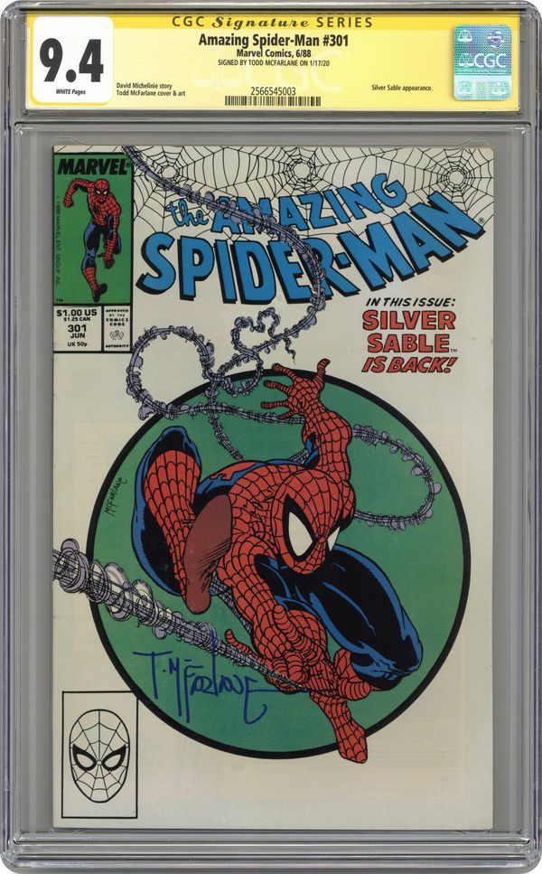 Ended Mar 11 2020 Winning Bid $136 Direct Edition. "The Sable Gauntlet!" Guest-starring Silver Sable. Script by David Michelinie. Art by Todd McFarlane. Cover by Todd McFarlane. The first 300 issues of the Amazing Spider-Man are in the books after the web-slinger's epic battle vs. Venom last issue! And now the next chapter in the wall-crawler's anthology begins with an encounter with his favorite mercenary: Silver Sable! The enchanting sable agrees to make a test run through the security systems of a new high-rise office building, but deadly danger awaits on the top floor! Will Spidey catch the elevator in time? Cameo appearances by Mary Jane Watson and Dr. Morris Sloan. First $1.00 issue. (Notes: The cover is the same artwork (with different colors) as the cover to issue 300. This issue includes a full-page ad for the first appearance of Typhoid Mary in the Daredevil (1st) series -- art by John Romita Jr. and Al Williamson. The letters page contains a statement of ownership: average print run 469,913; average paid circulation 284,692. 36 pgs. Cover price $1.00. Grade: CGC 9.4 explanation of grade Condition: Used (collectible)