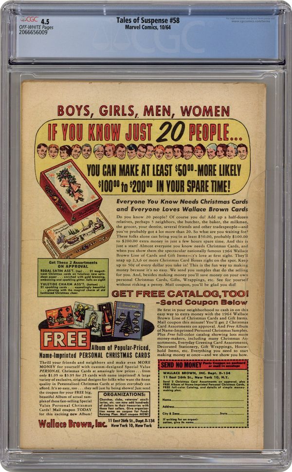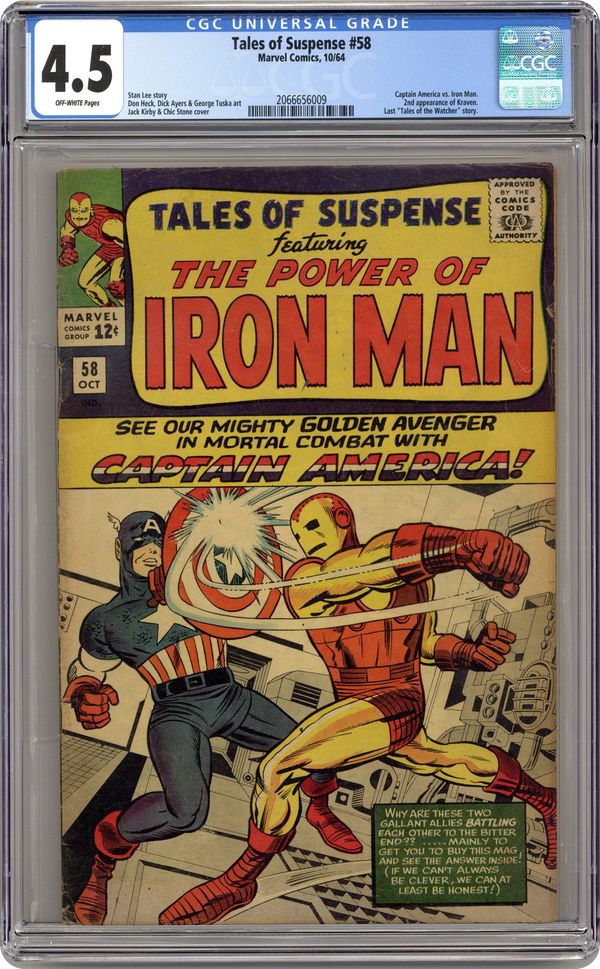 Ended May 7 2020 Winning Bid $107 Cover pencils by Jack Kirby, inks by Chic Stone. Captain America (first appearance in this title) battles Iron Man in "In Mortal Combat with Captain America!", script by Stan Lee, pencils by Don Heck and Jack Kirby, inks by Dick Ayers; The Chameleon tricks Iron Man into attacking Captain America, and the two fight until the misunderstanding is discovered; Second Kraven the Hunter appearance; Giant-Man and Wasp appearances. "The Runner!" text story. "The Watcher Must Die!", script by Stan Lee, art by George Tuska; An alien warlord attacks the Watcher, and is instantly destroyed by accelerated aging; This is the last Tales of the Watcher story in Tales of Suspense; Another series starts as a back-up in Silver Surfer (1968 series) #1. 36 pgs., full color. $0.12. Cover price $0.12. Grade: CGC 4.5 explanation of grade Condition: Used (collectible)