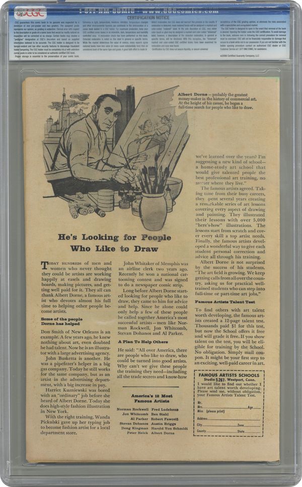 Ended May 6 2020 Winning Bid $180 Cover by Jack Kirby and Dick Ayers. Rommbu! Part One, art by Jack Kirby and Dick Ayers; An escaped geologist convicted of armed robbery leads an alien invader to an active volcano in order to sacrifice himself to destroy the alien and protect the planet. Rommbu! Part Two, art by Jack Kirby and Dick Ayers. The Tree text story. The Thing with the Red Eyes, art by Don Heck; A gangster buys a pincushion doll that looks like his rival, and his reactions to pins stuck in it convince him that it works. The Terrible Trap!, art by Steve Ditko; A hunter with contempt for the animals he captures is captured by giant aliens and placed in a maze from which he can see a rocketship he could use to pilot his way home if only he could figure out how to escape the maze. 36 pgs., full color. $0.10. Cover price $0.10. Grade: CGC 6.5 explanation of grade Condition: Used (collectible)