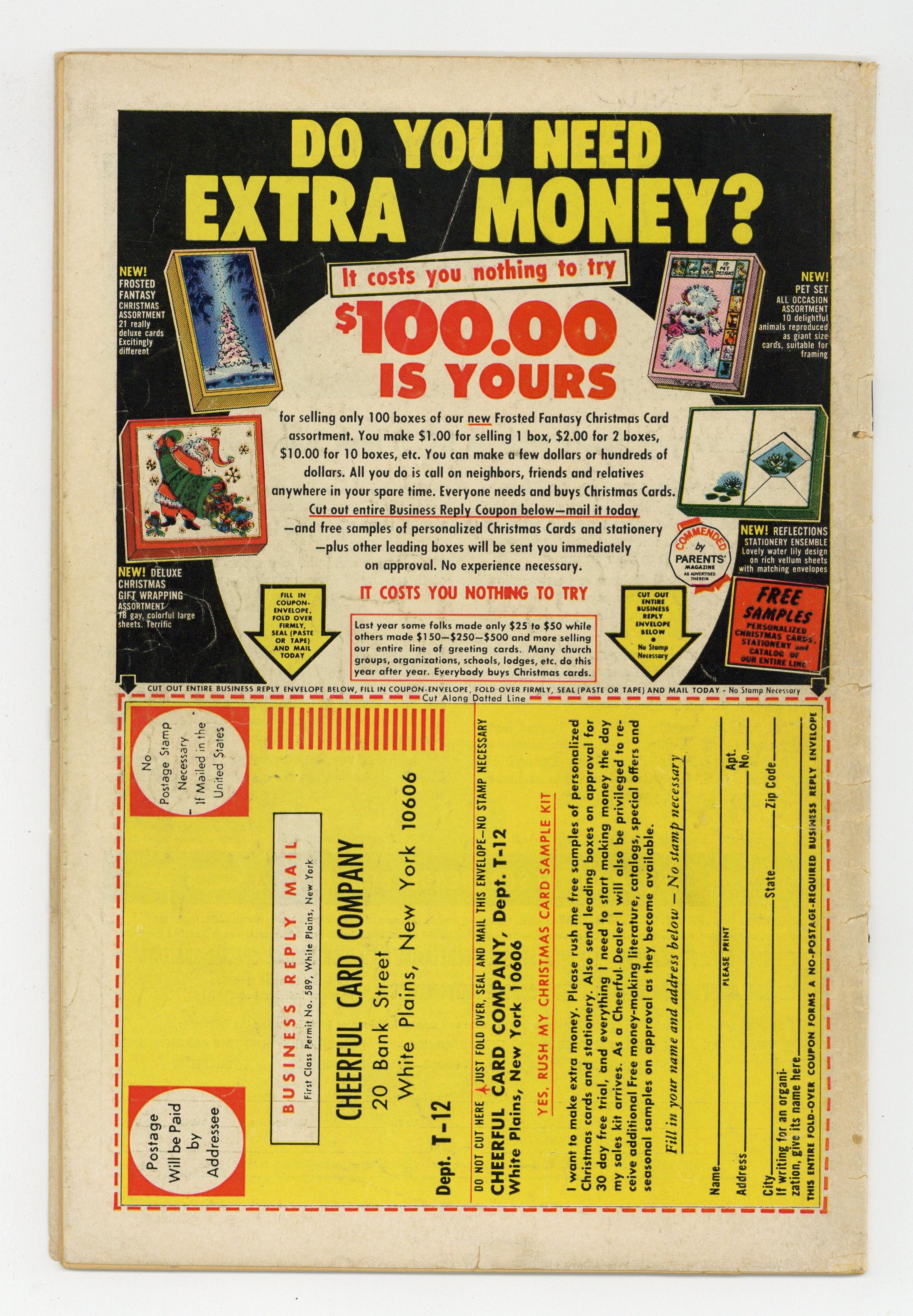 Poor choice of words cover that slipped past the Comics Code! Cover by Dan DeCarlo. Stories by Frank Doyle and unknown. Art by Dan DeCarlo, Rudy Lapick and unknown. In this issue: "The Salvage Depot"; "Country Club"; "The Dating Game" by Frank Doyle, Dan DeCarlo and Rudy Lapick - If Betty can get Archie to hold her hand, Veronica will allow her to have a date with him; and "In Hot Water" by Frank Doyle, Dan DeCarlo and Rudy Lapick - When Betty and Veronica learn that Archie is home sick they both rush over to nurse him back to health. Plus: Betty answers readers' letters in Dear Betty letters page with art by Joe Edwards; 1-pager "Bong!"; and Li'l Jinx 1-pager "Wrong Numbers" by Joe Edwards. 32 pages, full color. Cover price $0.12. Grade: GD 2.0 explanation of grade Condition: Used (collectible)