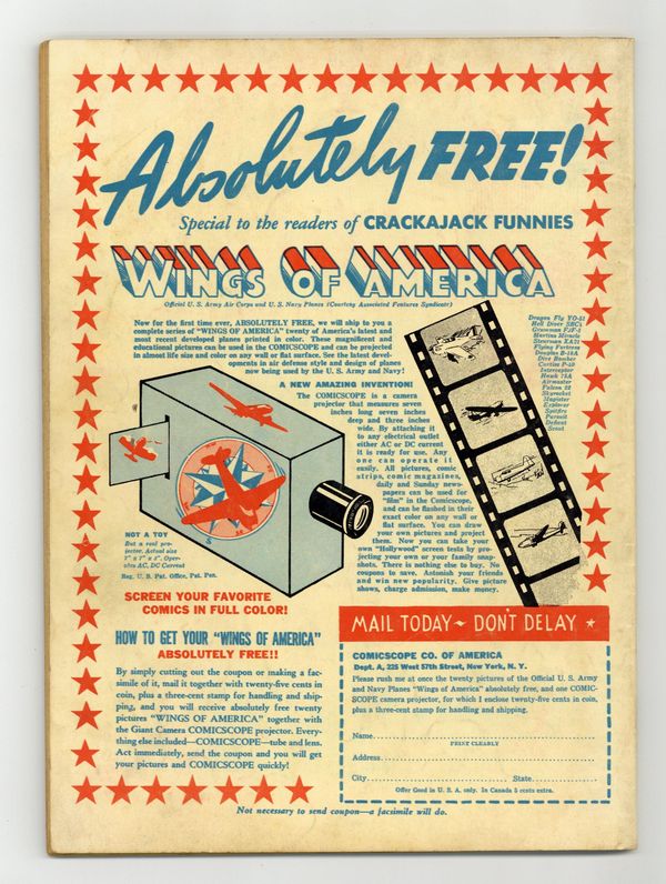 Ended May 7 2020 Winning Bid $206 Cover by Frank Thomas. Stories and art by Bill Holman, Al McWilliams, Bill Connor, William Treadwell, Bill Ely, Frank Thomas, Gaylord Du Bois, John Hampton, Frank V. Martinek, Leon A. Beroth, Al Micale, Jim Chambers, and Robert Brice. Crackajack Funnies presented reprints of classic comic strips alongside original features like The Owl. The Owl discovers that not only does criminally insane Ma Madespo have a trained gorilla (in a three-piece suit), but her house has more military hardware than a Normandy bunker. On the rim of an active volcano, Clyde Beatty discovers a strange tribe about to sacrifice two women. This issue also features the comic-book debut of Andy Panda, the Walter Lantz cartoon character who would go on to have a long career in comics. Ellery Queen; Smokey Stover; Bob and Bill; Cyclone; The Owl; Clyde Beatty; Just a Kid; Gabby Scoops; The Crusoes; Andy Panda; True Spy Stories; Stratosphere Jim; Don Winslow of the Navy. 64 pages, Full Color. Cover price $0.10. Grade: VG- 3.5 explanation of grade Condition: Used (collectible)