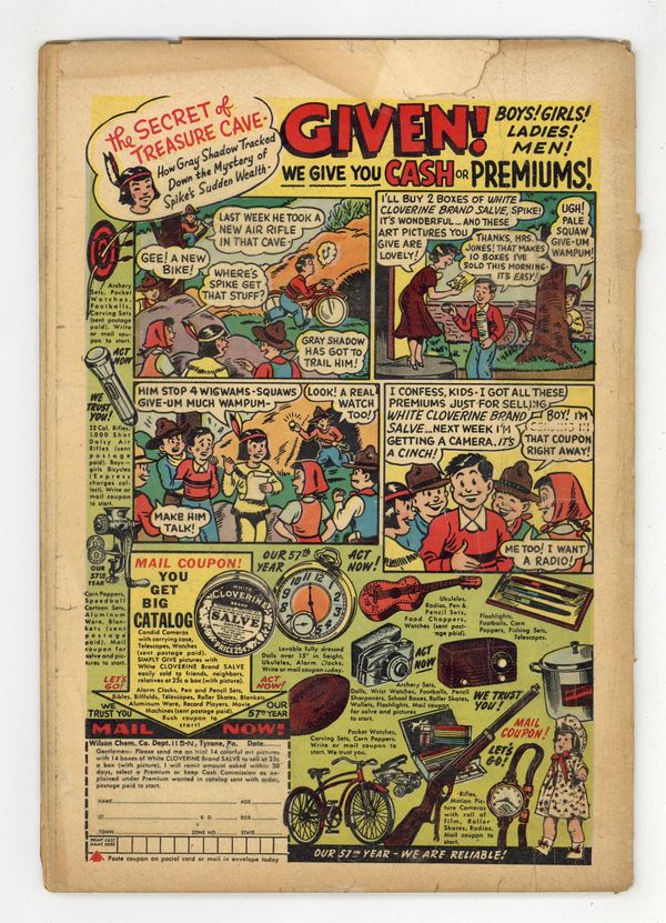 Ended May 7 2020 Winning Bid $92 Cover by Win Mortimer. It's Smart to Check -- And Double Check! public service announcement starring Superman, script by Jack Schiff, art by Winslow Mortimer. "The Jungle Batman!", script by David Vern, pencils by Bob Kane (Batman and Robin figures only) and Lew Sayre Schwartz, inks by Charles Paris; After capturing the feared Sinister Eight, Commissioner Gordon asks the Dynamic Duo to deliver the crooks by radio-controlled ship to their prison at Satan's Island; The ship is torpedoed and sunk during a storm at sea. Two-page Varsity Vic story by Henry Boltinoff. "The Legion of Faceless Men!", pencils by Dick Sprang, inks by Charles Paris; Batman and Robin get invited to a party at The Maskers Club, which is formed by people who wear masks at their jobs; After the party, crime ensues. Half-page Private Pete story by Henry Boltinoff. One-page Peg story by Henry Boltinoff. Changing Styles In Magic article by David Kahn (as Donald King), art by Raymond Perry. Half-page Shorty story by Henry Boltinoff. "The Death-Cheaters of Gotham City!", script by David Vern, art by Jim Mooney (as Bob Kane); Batman becomes a member of the strange "Death Cheaters Club," but a wanted criminal, who fits the qualifications for membership, is denied the same--and vows vengeance against all the members! Casey the Cop one-page story by Henry Boltinoff. 52 Pages, Full Color. Cover price $0.10. Grade: FR/GD 1.5 explanation of grade Condition: Used (collectible)