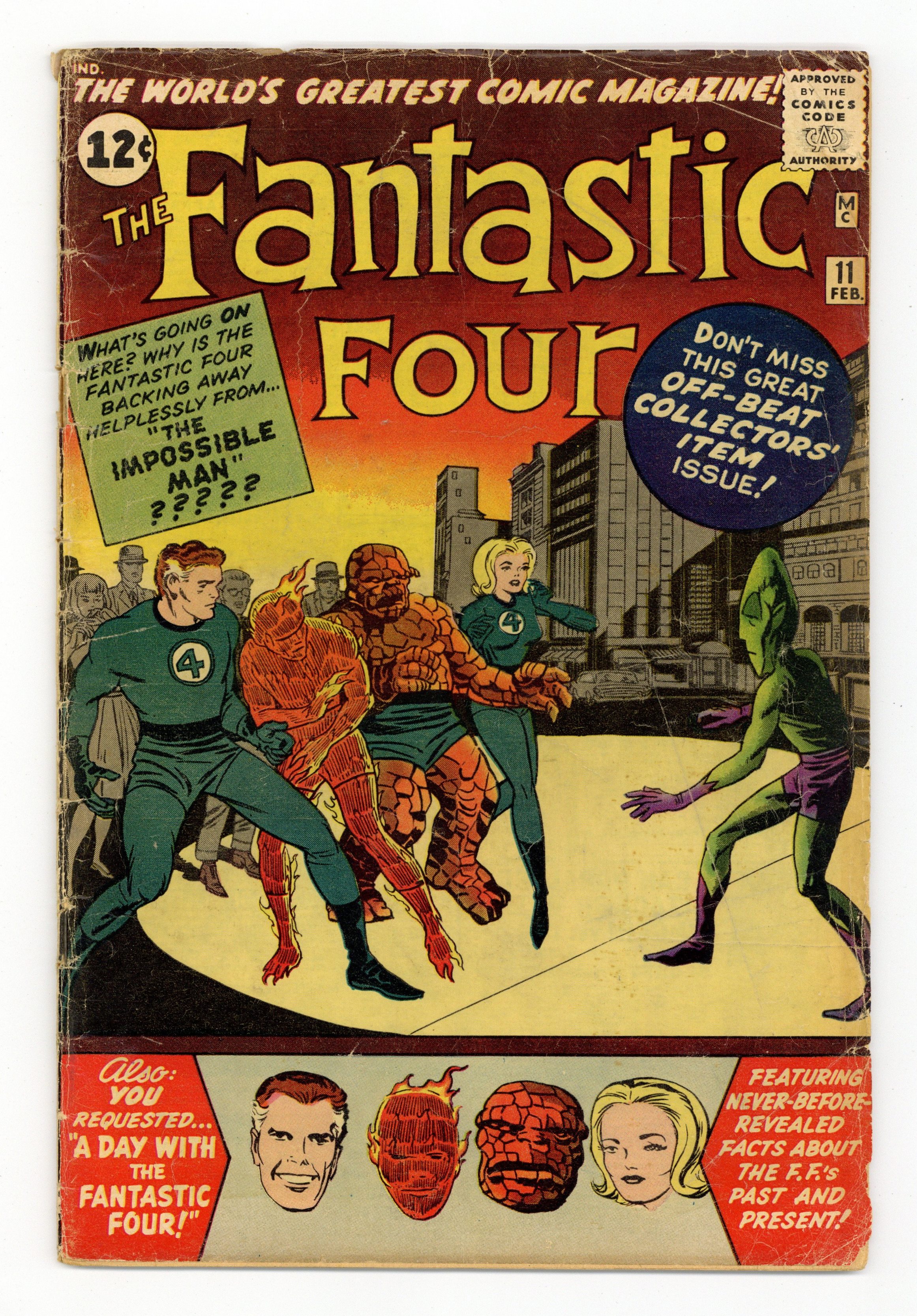 Ended May 5 2020 Winning Bid $79 Cover art by Jack Kirby. Origin and first appearance of the Impossible Man in "The Impossible Man!", script by Stan Lee, pencils by Jack Kirby, inks by Dick Ayers; The police call the Fantastic four to help against a childish extra-terrestrial. A Visit with the Fantastic Four, script by Stan Lee, pencils by Jack Kirby, inks by Dick Ayers; Willie Lumpkin (first appearance) brings to the Fantastic Four their huge mailbag; It makes them think about their youths and their origin. Cameos by Skrulls and Doctor Doom. Pin-up of Namor and his undersea headquarters, pencils by Jack Kirby, inks by Dick Ayers. 36 pgs. $0.12. Cover price $0.12. Grade: GD 2.0 explanation of grade Condition: Used (collectible)