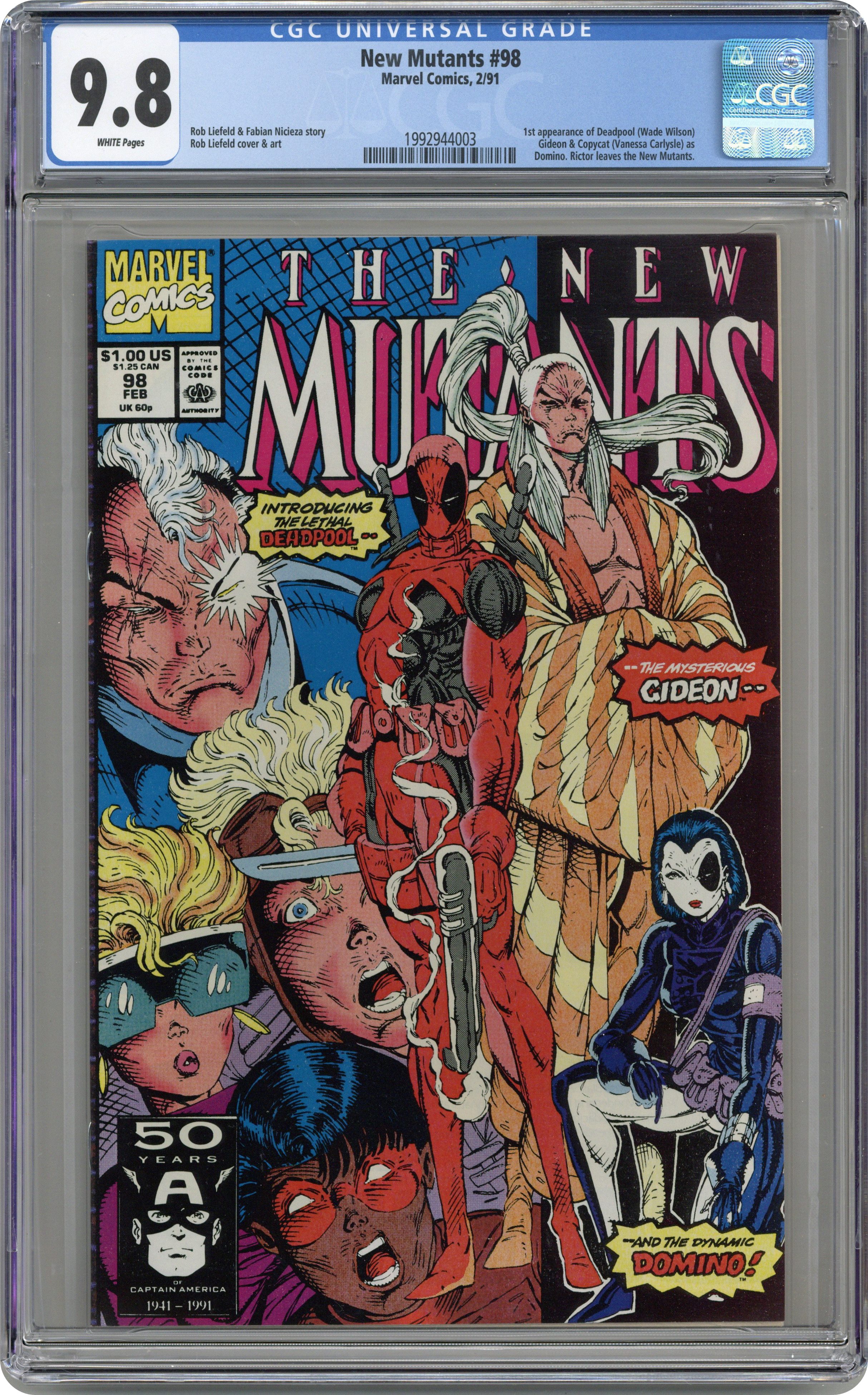 Ended May 7 2020 Winning Bid $896 1st appearance of Deadpool, Gideon, and Domino (Impersonated by Copycat). Cover pencils by Rob Liefeld. The Beginning of the End, Part One, script by Rob Liefeld (plot) and Fabian Nicieza (script), art by Rob Liefeld; Gideon arranges for the murder of Sunspot's father; Deadpool, working for Mr. Tolliver, attacks Cable; Domino defeats him; Cable and Domino plot strategy; Rictor decides to go after Wolfsbane, who stayed in Genosha; Gideon tells Sunspot his father is dead. Part 1 of 3. 36 pgs. The Domino that appears in this issue is actually the mutant known as Copycat. The real Domino makes her first real appearance in he pages of X-Force (1991-2002 1st Series) #8 and 11. Cover price $1.00. Grade: CGC 9.8 explanation of grade Condition: Used (collectible)