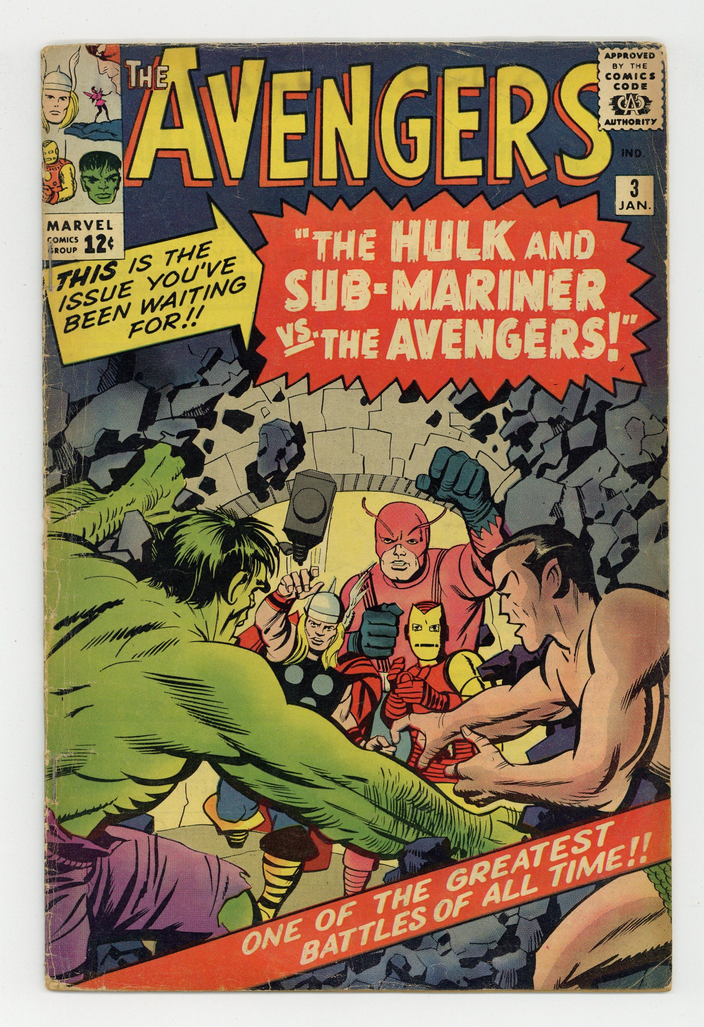 Ended May 5 2020 Winning Bid $160 Cover pencils by Jack Kirby, inks by Paul Reinman. The Avengers Meet... Sub-Mariner!, script by Stan Lee, pencils by Jack Kirby, inks by Paul Reinman; After he left them, the Avengers feel responsible for the damages that the Hulk may cause; They start a search for him and find him. When they start to battle, the Sub-Mariner joins the Hulk. Roster includes: Thor, Giant-Man, Wasp, and Iron Man. Guest appearances by the Hulk, Rick Jones, the Sub-Mariner, the Fantastic Four, Spider-Man, the original X-Men, Odin, and miscellaneous Asgardians. 36 pgs. $0.12. Cover price $0.12. Grade: GD+ 2.5 explanation of grade Condition: Used (collectible)