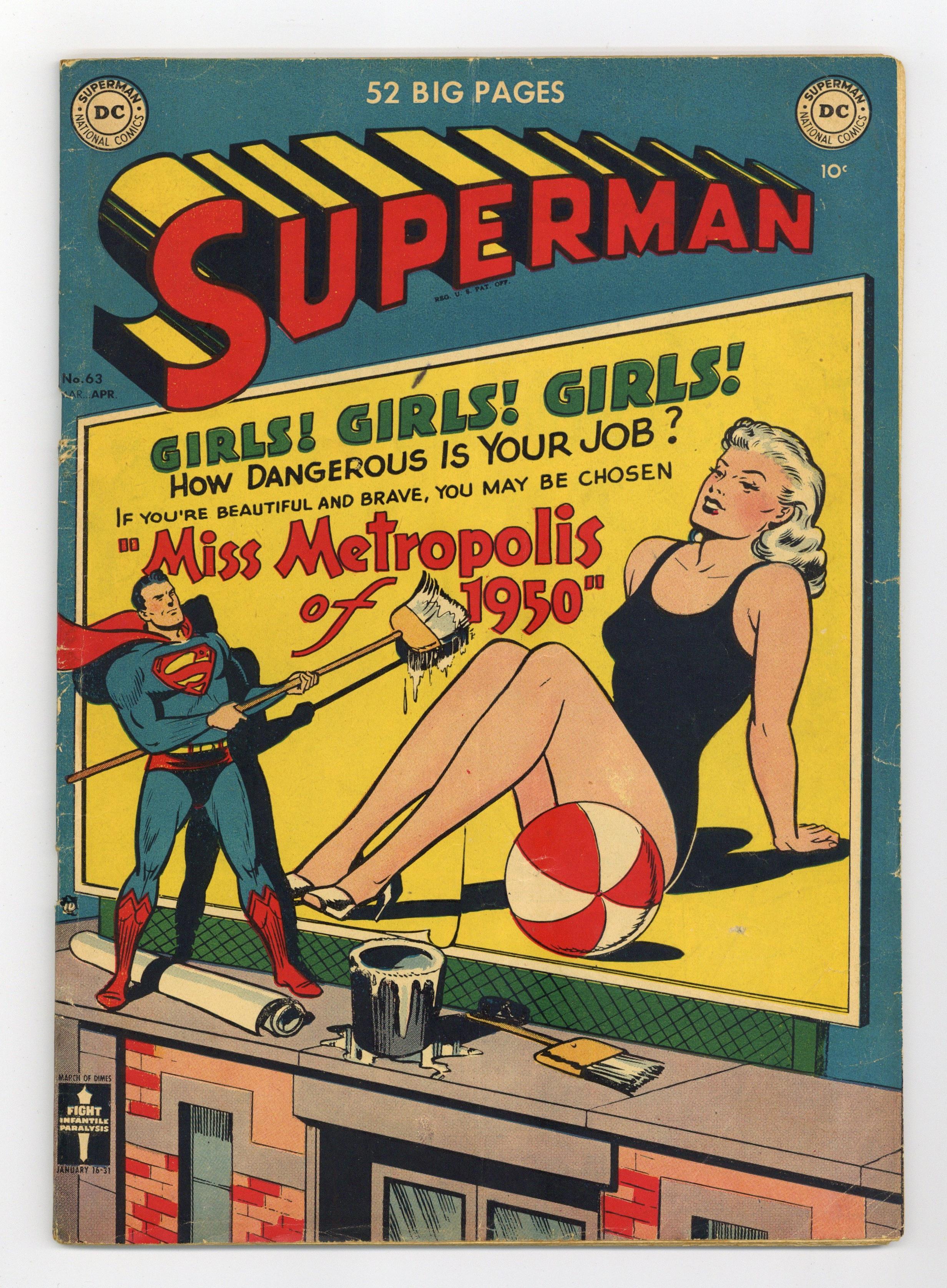 Ended May 5 2020 Winning Bid $215 Cover art by Al Plastino. Achilles Vs. Superman, script by Edmond Hamilton, pencils by Wayne Boring, inks by Stan Kaye; John Achilles claims to be the invulnerable descendant of the Greek original. The Wind-Up Toys of Peril, art by Al Plastino; Toyman tries to use Superman toys to make a sap out of the Man of Steel. It's Fun to Be Healthy! public service announcement starring Wonder Woman, script by Jack Schiff, art by Irwin Hasen. Shorty humor two-pager by Henry Boltinoff. Peg humor page by Henry Boltinoff. Miss Metropolis of 1950, pencils by Al Plastino, inks by Stan Kaye; Perry White tries to re-invent the beauty contest by requiring the contestants to perform daring stunts. 52 Pages, Full Color. Cover price $0.10. Grade: VG- 3.5 explanation of grade Condition: Used (collectible)
