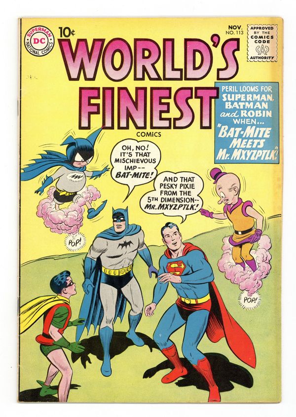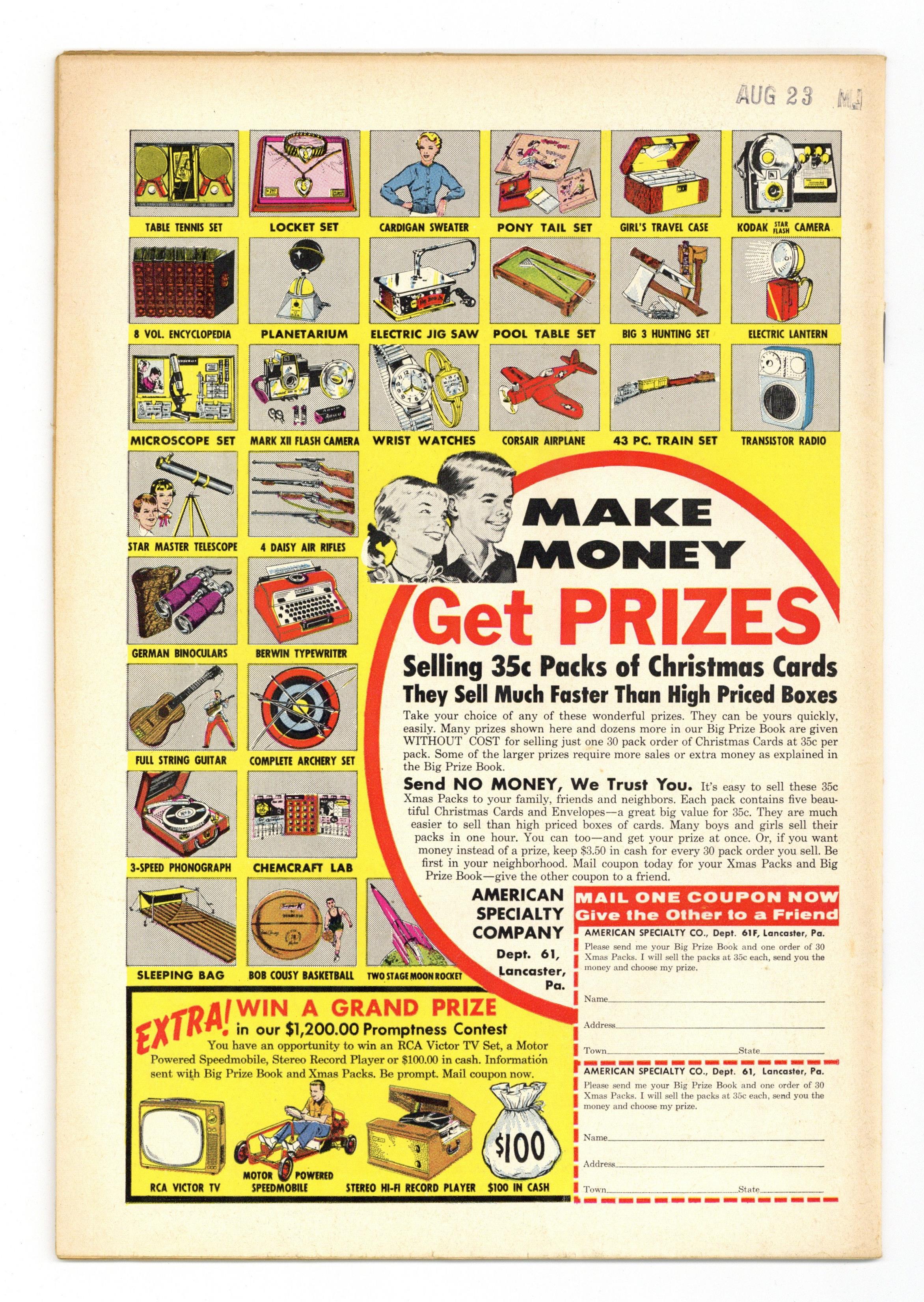 Ended May 6 2020 Winning Bid $70 Cover pencils by Curt Swan, inks by Stan Kaye. Bat-Mite Meets Mr. Mxyzptlk starring Superman and Batman, script by Jerry Coleman, pencils by Dick Sprang, inks by Sheldon Moldoff; Bat-Mite tries to stop Superman from helping Batman and Robin; Then Mr. Mxyzptlk decides that Bat-Mite should stop bugging Superman and a magic contest is begun between the two. Keep Learning -- the Key to Success! public service announcement, script by Jack Schiff, art by Bernard Baily. The Amazing Miss Arrowette, script by Dave Wood, art by Lee Elias; Miss Arrowette makes her debut by rescuing Green Arrow and Speedy from a gang of thieves. Dexter humor page by Henry Boltinoff. Journey to 1960 starring Tommy Tomorrow, script by Jack Miller, art by Jim Mooney. 36 Pages, Full Color. Cover price $0.10. Grade: FN- 5.5 explanation of grade Condition: Used (collectible)