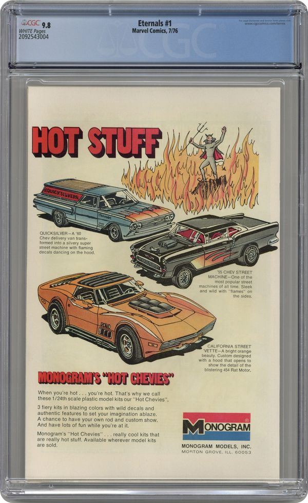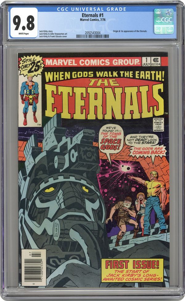 "The Day of the Gods." Written by Jack Kirby. Pencils by Jack Kirby. Inks by John Verpoorten. What if all the stories were true? All myths...all the legends... What if all the stories about gods and monsters were true? For archeologist Doctor Damian and his daughter Margo, those legends are about to become reality. The gods are real and they've lived among us for centuries. 1st appearance of Ikaris, Makkari, Kro and the Eternals as a team . 36 pages, full color. Cover price $0.25. Grade: CGC 9.8 explanation of grade Condition: Used (collectible)