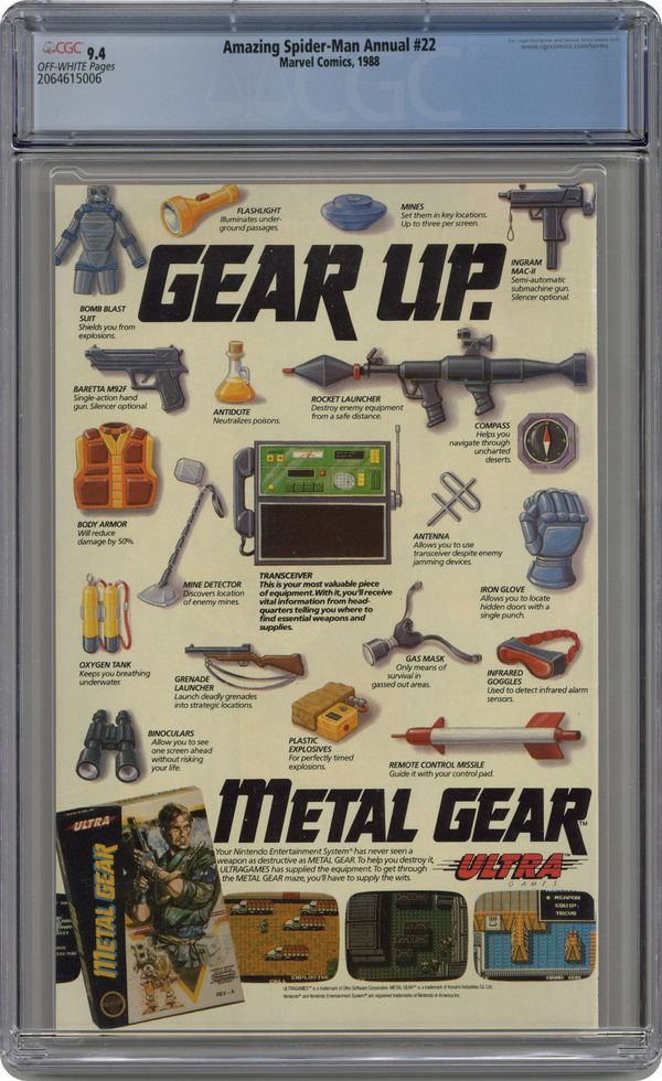Ended May 20 2020 Winning Bid $36 Direct Edition. "Drug War Rages" Guest-starring Daredevil and Speedball. Part 5 of the Evolutionary War storyline. First appearance of Speedball. Plot by Tom DeFalco. Script by David Michelinie. Pencils by Mark Bagley. Inks by Mike Esposito. Cover by Ron Frenz and Joe Rubinstein. What begins as a simple drug bust in a west side warehouse...escalates into a battle atop the Empire State Building to save the lives of everyone in the Big Apple! Along the way the Amazing Spider-Man teams up with a familiar ally, the Man Without Fear; and meets a new superhero: Speedball (aka Robbie Baldwin)! The High Evolutionary wants to sterilize New York's population to eradicate DNA strands deemed to be undesirable! Can the web-slinger, Daredevil, and Speedball defeat the Purifiers and maintain the gene pool status quo? The Evolutionary War storyline continues in Fantastic Four Annual 21. Appearances by the Kingpin, Arranger, Madeline Naylor, Mary Jane Watson, Ben Urich, and J. Jonah Jameson. First backup story: "He Who Laughs..." Plot by Steve Ditko. Script by Roger Stern. Pencils by Steve Ditko. Inks by Jackson Guice. Speedball battles a crazy stagehand seeking revenge against his mother. Second backup story: "Kindred Spirits" Story by Mark Gruenwald. Pencils by Ron Lim. Inks by Tony DeZuniga. Chapter 6 of the High Evolutionary's history. Inside his Wundagore Mountain citadel, Edgar Wyndham creates Bova -- the future nanny of Quicksilver and the Scarlet Witch; and foolishly ignores Magnus' warning that the spirit of Chthon is bound to Wundagore Mountain. First backup feature: Spider-Man and J. Jonah Jameson pin-up by Larry Lieber and Frank Giacoia. Second backup feature: 2-page diagram of Peter and Mary Jane's Bedford Towers apartment. Third backup feature: Two unpublished Amazing Spider-Man covers -- the first by Larry Lieber & Jack Abel; the second by Bob Layton. (Note: Fantastic Four Annual 21 is the 6th part of the Evolutionary War storyline, but the 5th chapter of the history presented in the backup stories.) 68 pages. Cover price $1.75. Grade: CGC 9.4 explanation of grade Condition: Used (collectible)