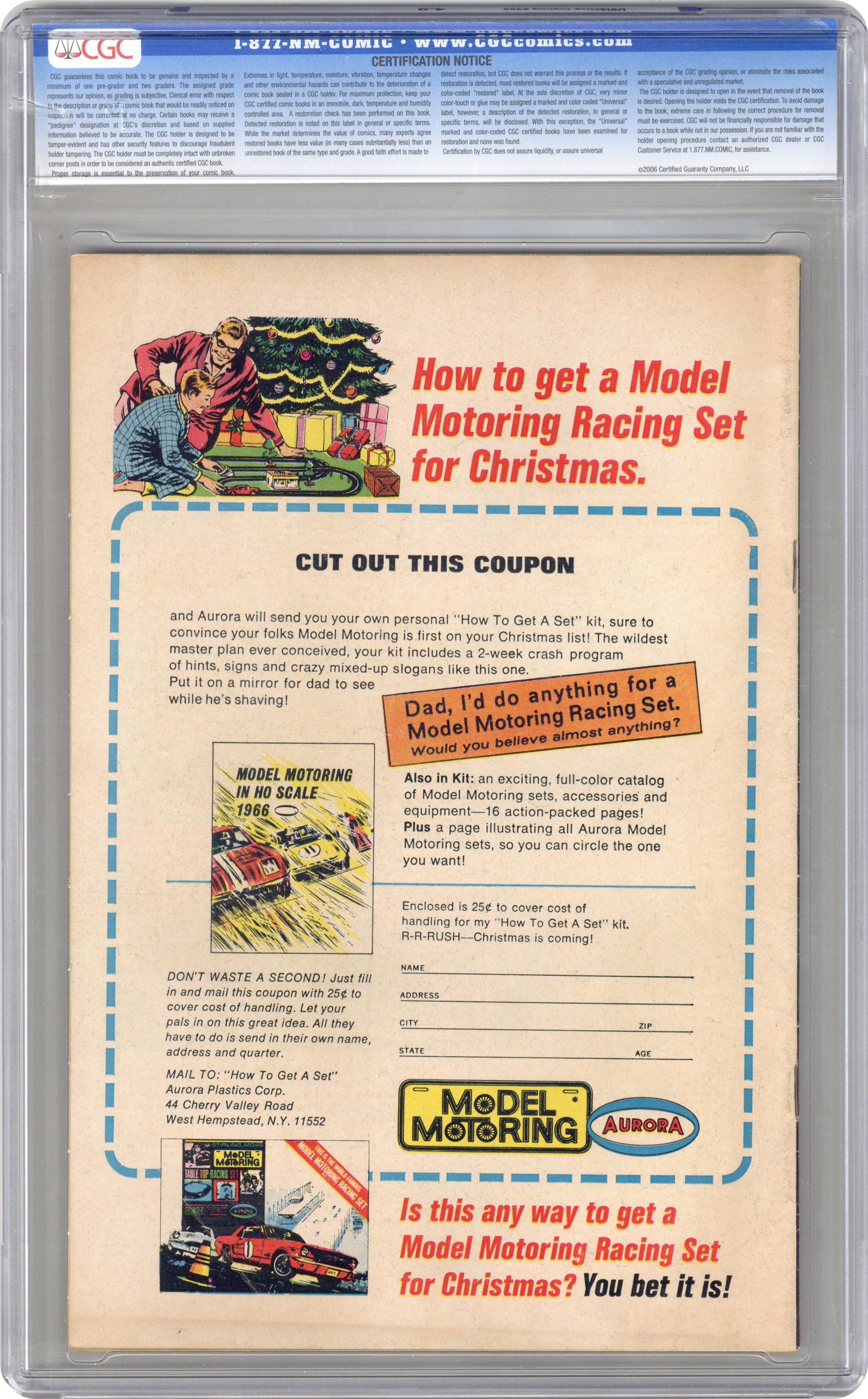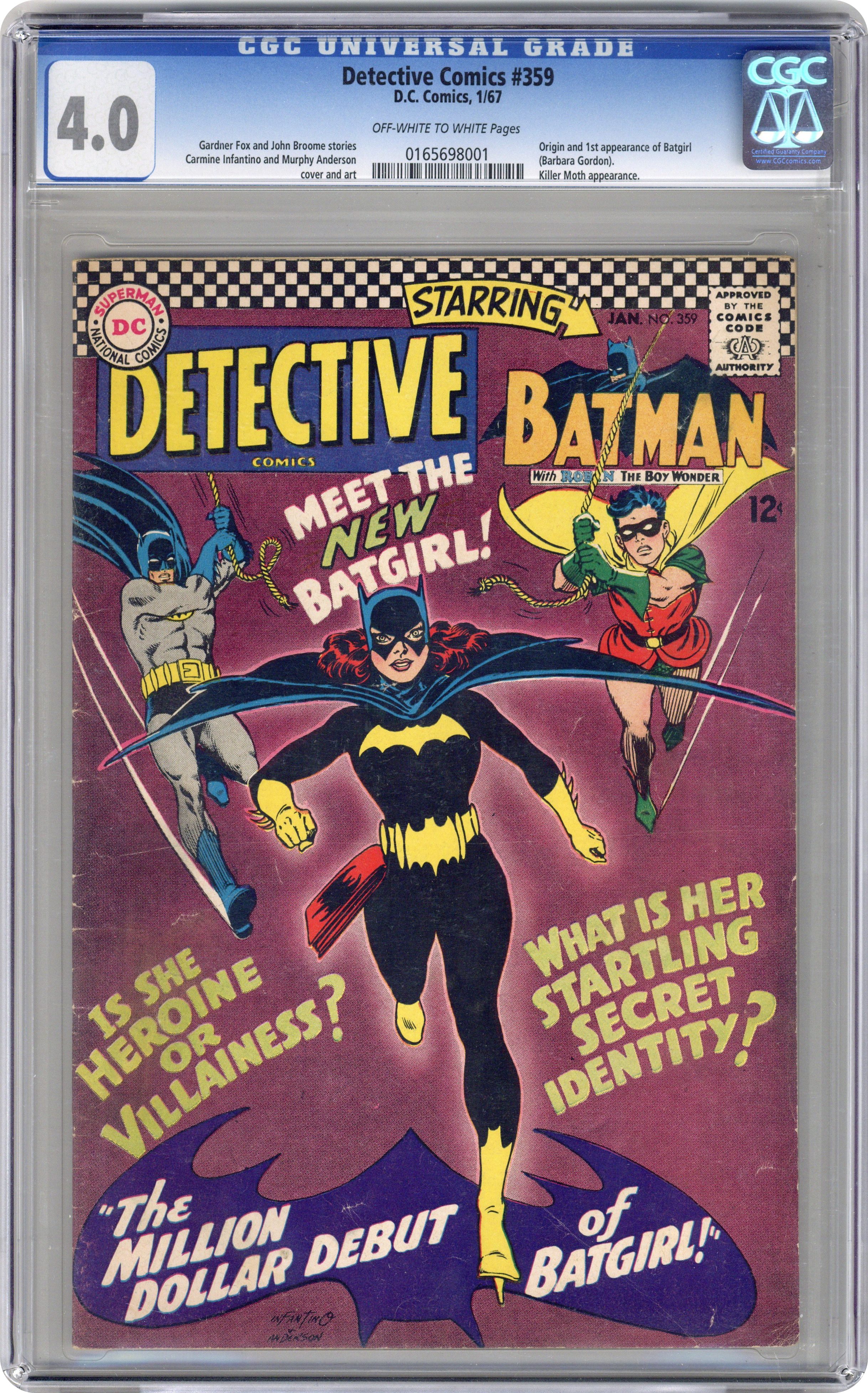 Ended May 7 2020 Winning Bid $415 Written by Gardner Fox. Art by Carmine Infantino and Sid Greene. Cover by Carmine Infantino and Murphy Anderson. 1st appearance of the new Batgirl (Barbara Gordon) in The Million Dollar Debut of Batgirl!; Batgirl goes to a costume party dressed as Batgirl; she sees Killer Moth attack Bruce Wayne. Written by Gardner Fox. Art by Murphy Anderson. Riddle of the Sleepytime Taxi!; Ralph Elongated Man Dibny and Sue fall asleep in the back seat of a taxi while going to a costume party; Ralph discovers that crooks criminals are putting passengers to sleep to copy secret documents. Cap's Hobby Hints activity page by Henry Boltinoff. Letter to the editor from comics writer Mark Evanier. 36 pages, full color. $0.12. Cover price $0.12. Grade: CGC 4.0 explanation of grade Condition: Used (collectible)