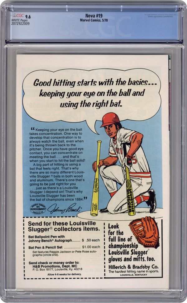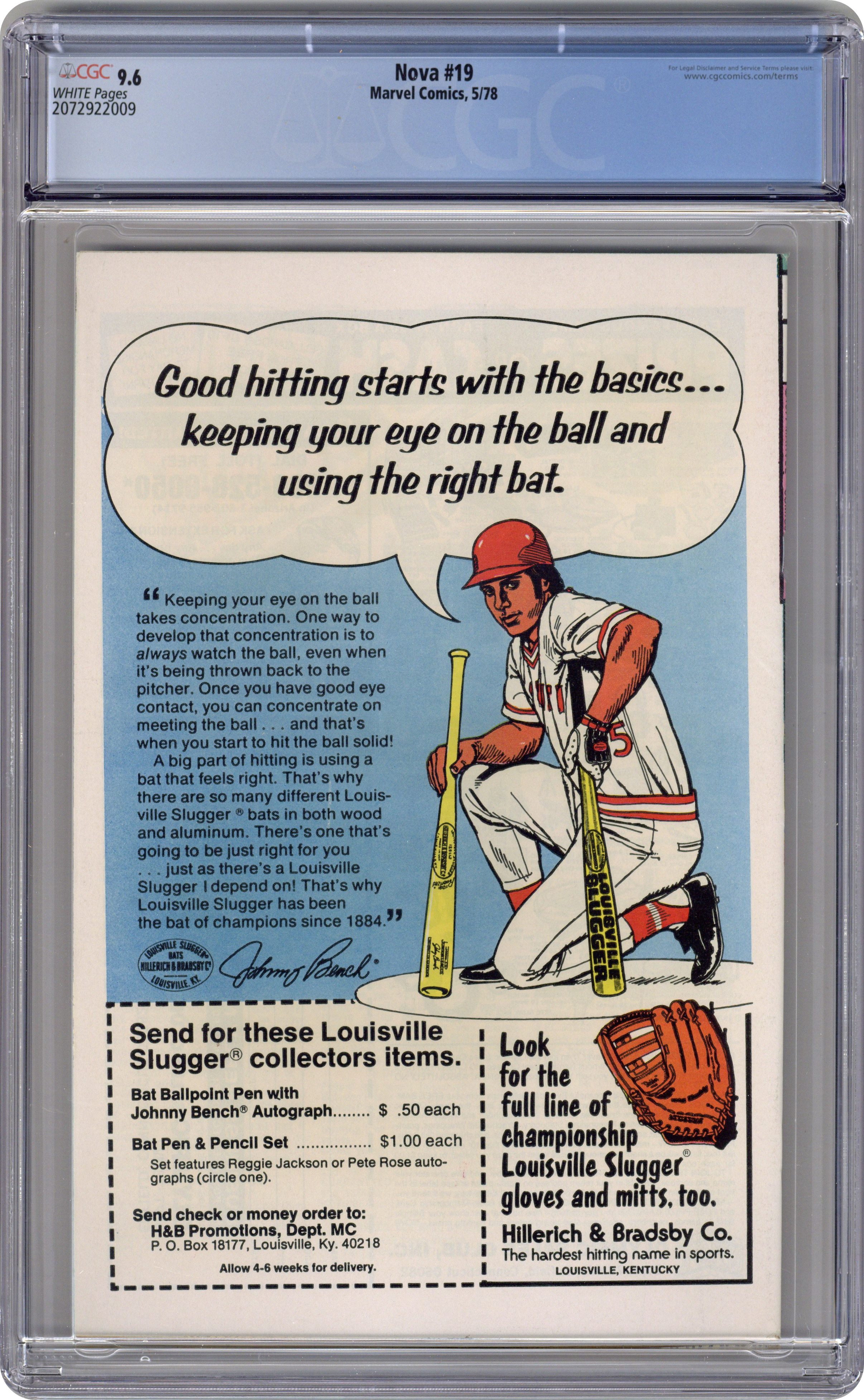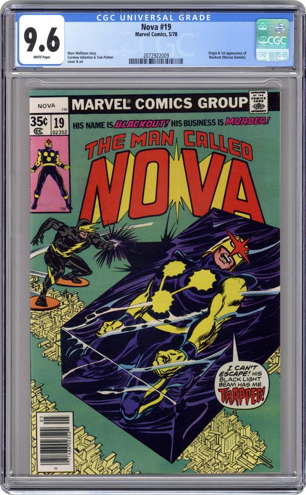 Ended May 12 2020 Winning Bid $36 "Blackout means Business, and his Business is Murder!" Story by Marv Wolfman. Art by Carmine Infantino and Tom Palmer. As Nova patrols the skyways he is attacked by the murderous man known as Blackout. Can the Human Rocket penetrate the villains black light beam and end his rampage before Blackout murders again? 32 pages. Cover price $0.35. Grade: CGC 9.6 explanation of grade Condition: Used (collectible)