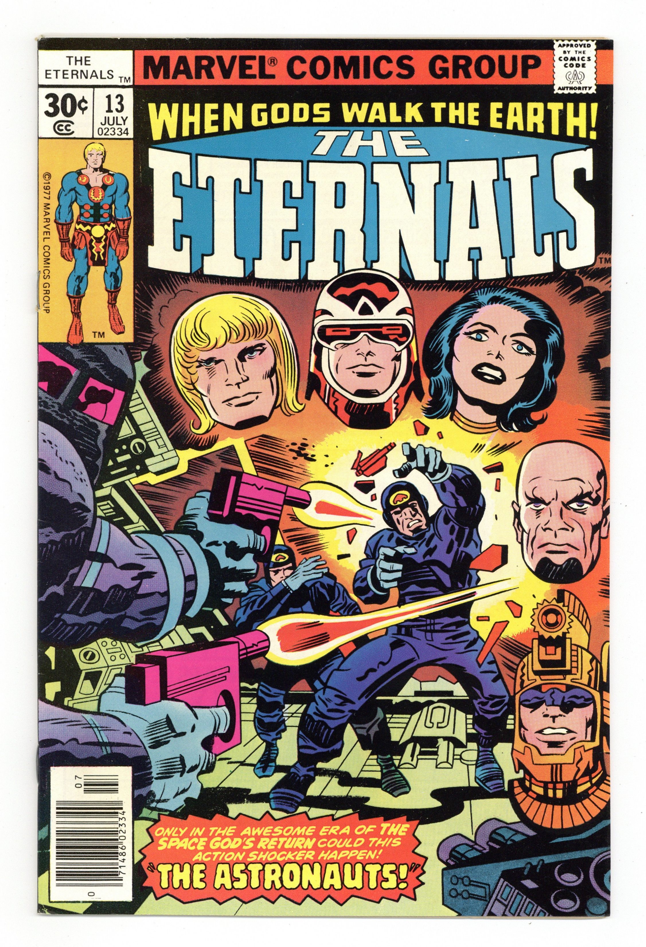 "The Astronauts!" Written by Jack Kirby. Pencils by Jack Kirby. Inks by Mike Royer. Only in the awesome era of the space god's return could these shocking events happen. Images once carved on stone by the ancient Incas have come to life, and they've come to Earth! The space gods have returned! A new awareness of the past, present, and future has gripped mankind in the wake of their arrival. While the giant Celestials roam the planet, their monstrous spacecraft orbits the Earth. This is the story of those who were sent to investigate that spacecraft. Note: First appearance of Gilgamesh (the Forgotten One). First appearance One Above All, previously first mentioned in Eternals 7. Cover price $0.30. Grade: FN/VF 7.0 explanation of grade Condition: Used (collectible)